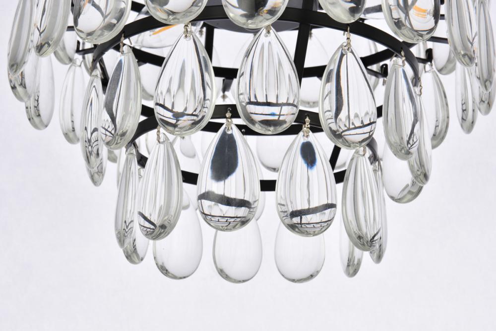 Tiers of clear smooth almond shaped crystals reflect the soft glow of candelabra bulbs