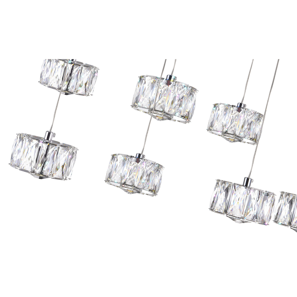 The Milan 10 Pendant LED Chandelier brings in elegance and glamour with its sleek yet delicate style. This large multi Light pendant is designed with a rectangular canopy in chrome holding ten glittering sources of light. Each pendant has its sides covered