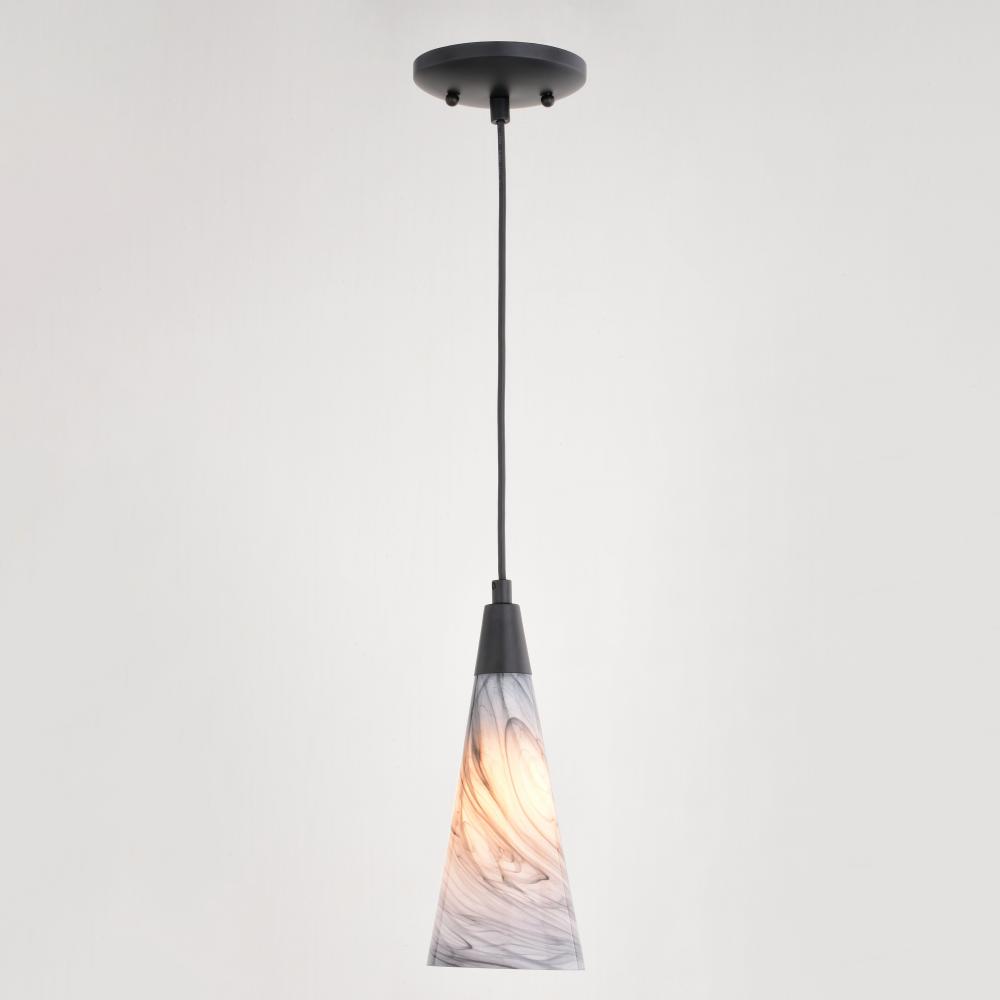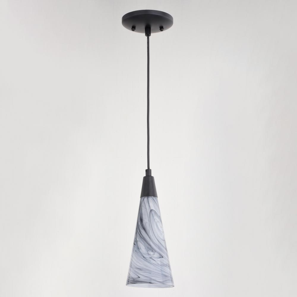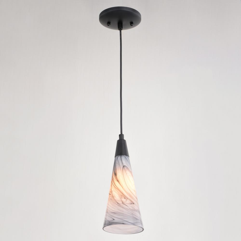 The Milano collection of art glass mini pendant lights feature hand-blown glass which gracefully blend into almost any decor. Because each glass is handcrafted utilizing century-old techniques, no two pieces are identical. The marble swirl colored glass has tones of gray and silver in an updated elongated cone shape. Accented in an artistic matte black finish with matching black cord which can be cut to size to adjust the hanging height. Install this mini pendant individually or in a grouping; ideal for kitchens, dining areas, or bar areas.
