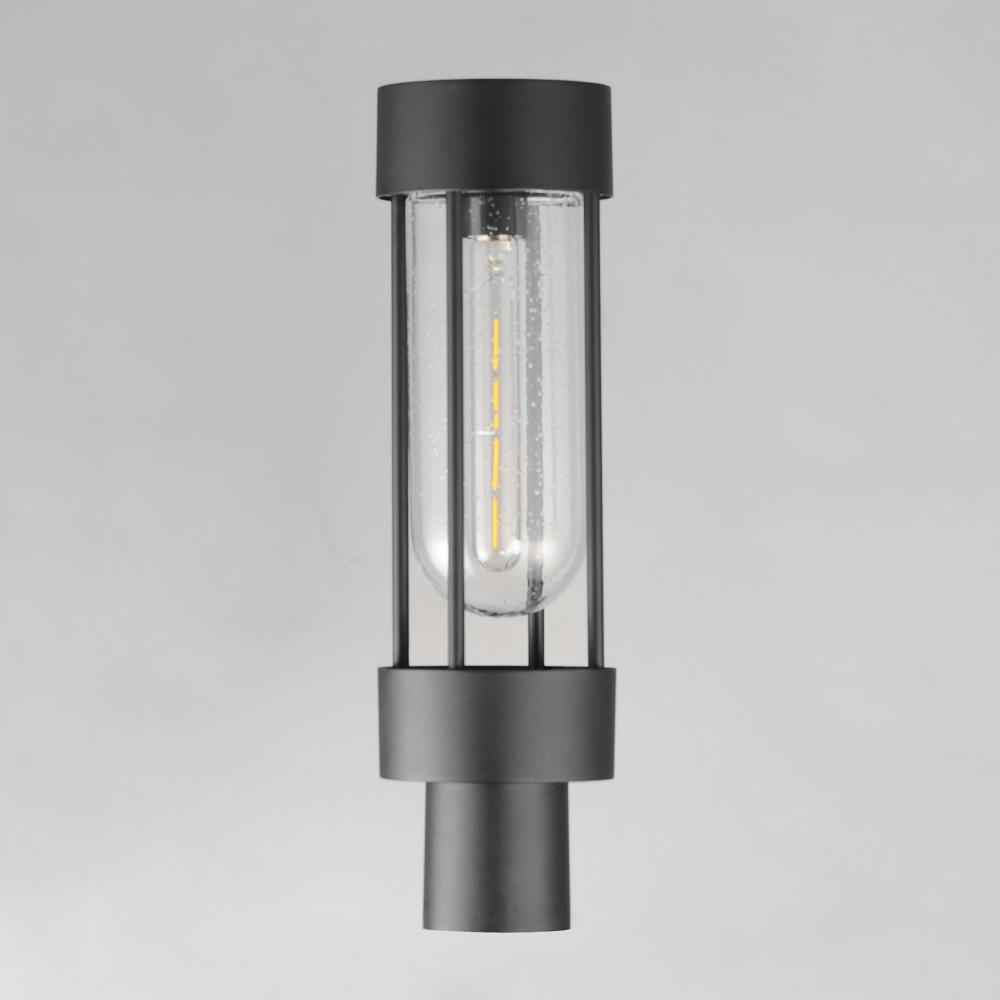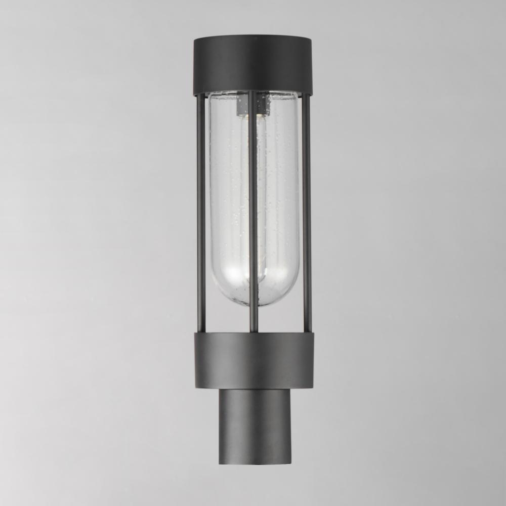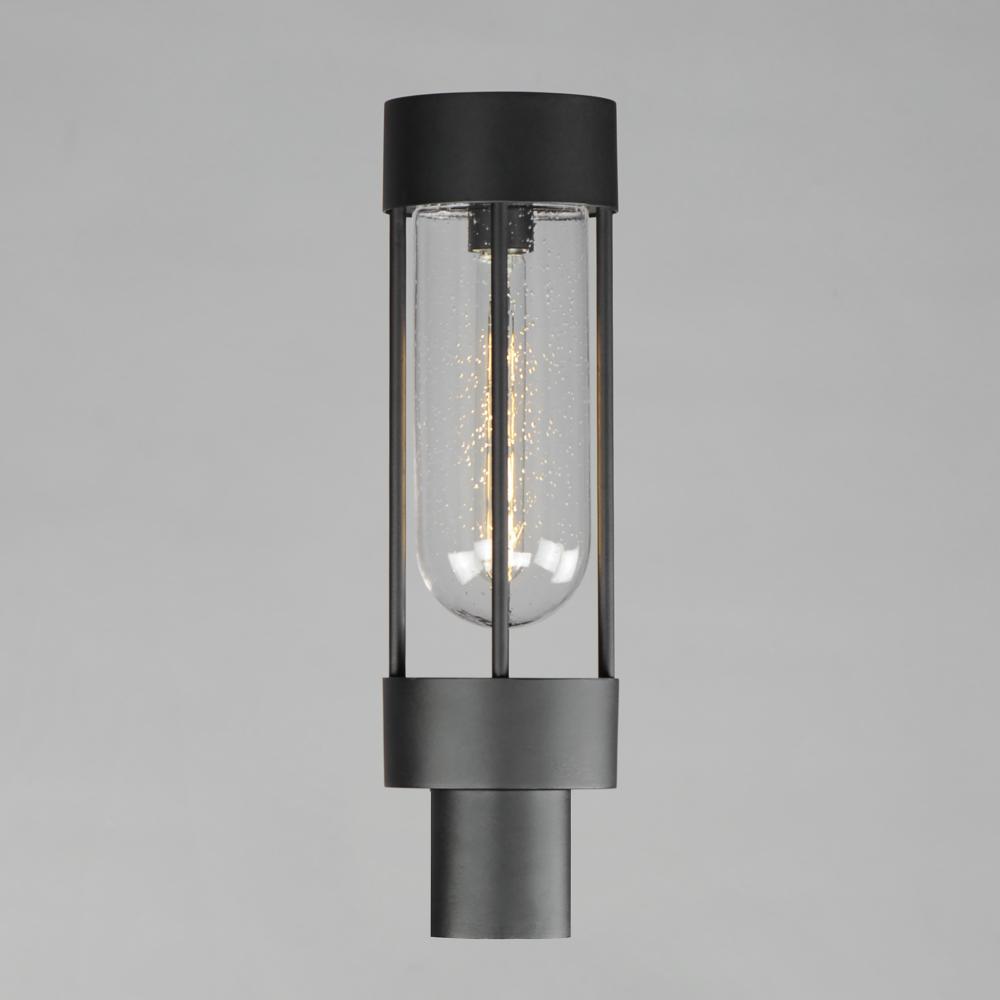 Clean and contemporary, this series of wet location rated outdoor sconces features a capsule of Clear Seeded glass encased within a cage of matte Black outdoor rated powder coat. The transitional appeal of the design pairs well in applications both modern
