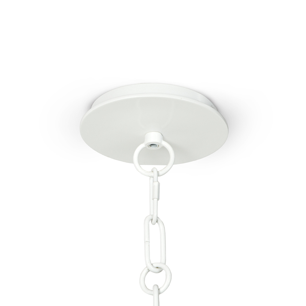 Chandelier features round core rattan sticks accented with rattan peel bindings over a metal frame all in a chalk-white finish complete with a white chain and canopy hanging kit. Professional installation recommended.