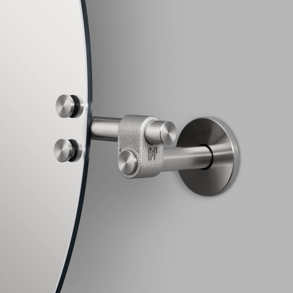 A mirror featuring our signature rough-cast knuckle, hand polished metal bar and circular mirror. The mirror can be tilted by hand to adjust to your height. Thanks to the casting process, each knuckle is one-of-a-kind. Suitable for all interior spaces, including bathrooms.