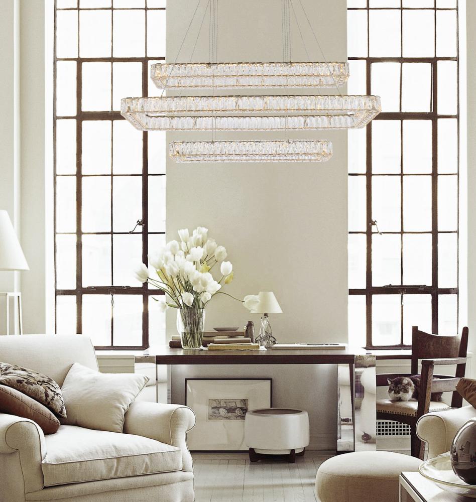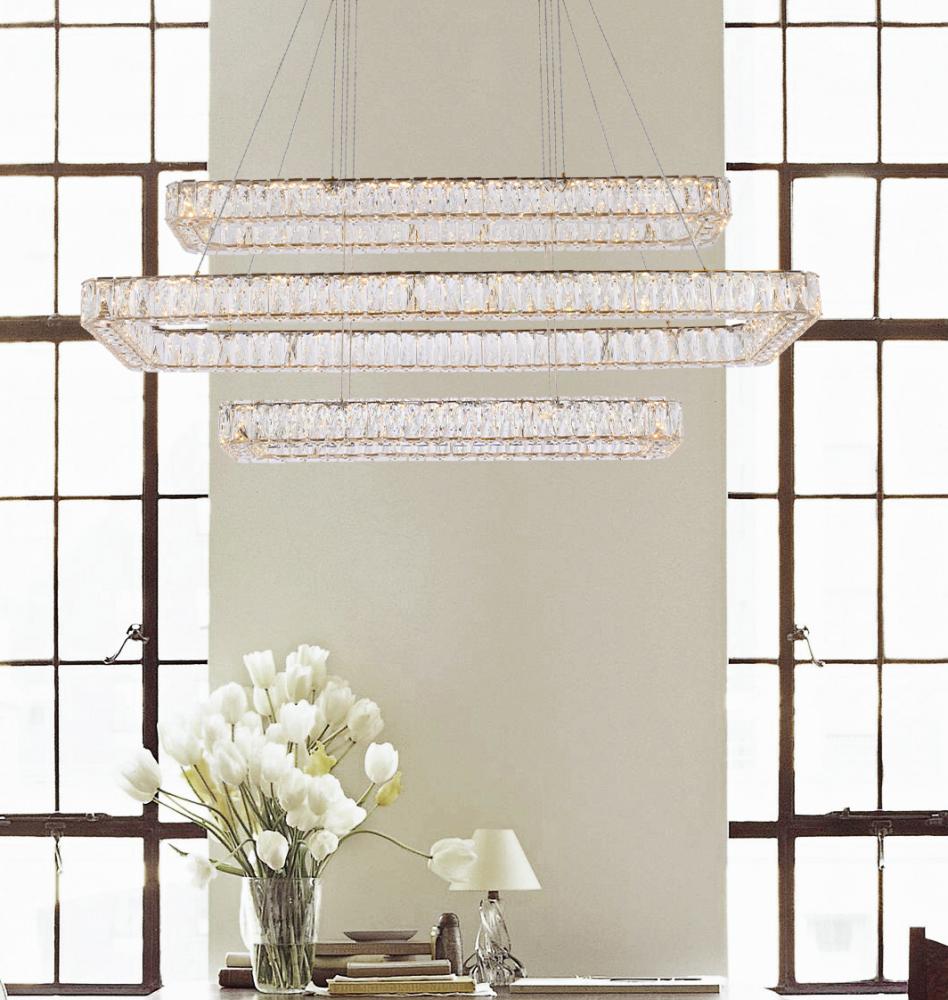Diamonds are a girl’s best friend, and sparkling Monroe collection hanging fixtures take Marilyn’s famous lines to heart … for women and men alike. A minimal stainless-steel frame becomes dazzling when it is covered entirely with rectangular and square spectacularly faceted clear crystals. The oblong design hangs from almost invisible wires with brilliant integrated LED shining unseen from within. Stunning when placed in a dining room, kitchen, living room, or bedroom.