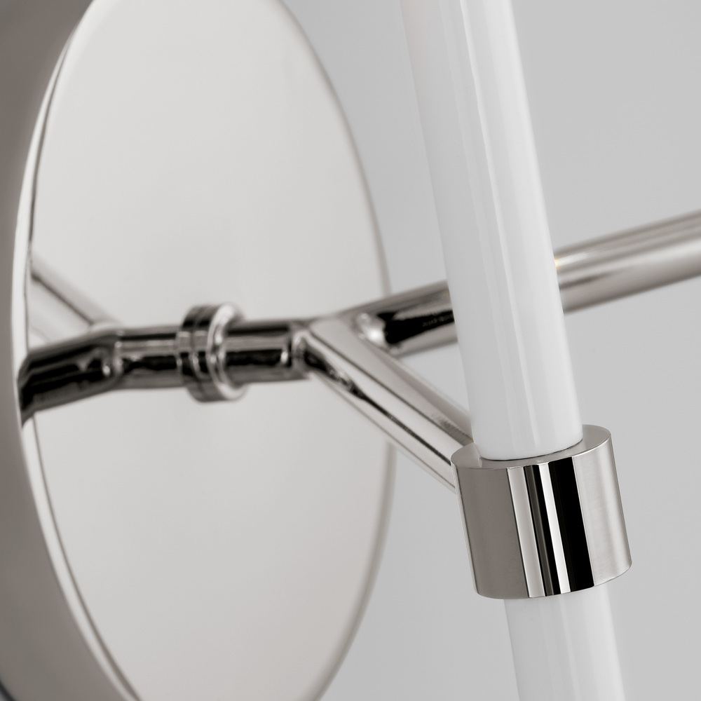 The Monroe two light wall sconce is inspired by graphic enameled metal jewelry and decorative accessories from kate spade with a nod to late 50s atomic era colorful designs. Monroe exhibits clean lighting profiles and dressed them up with painted sections and metal accents.