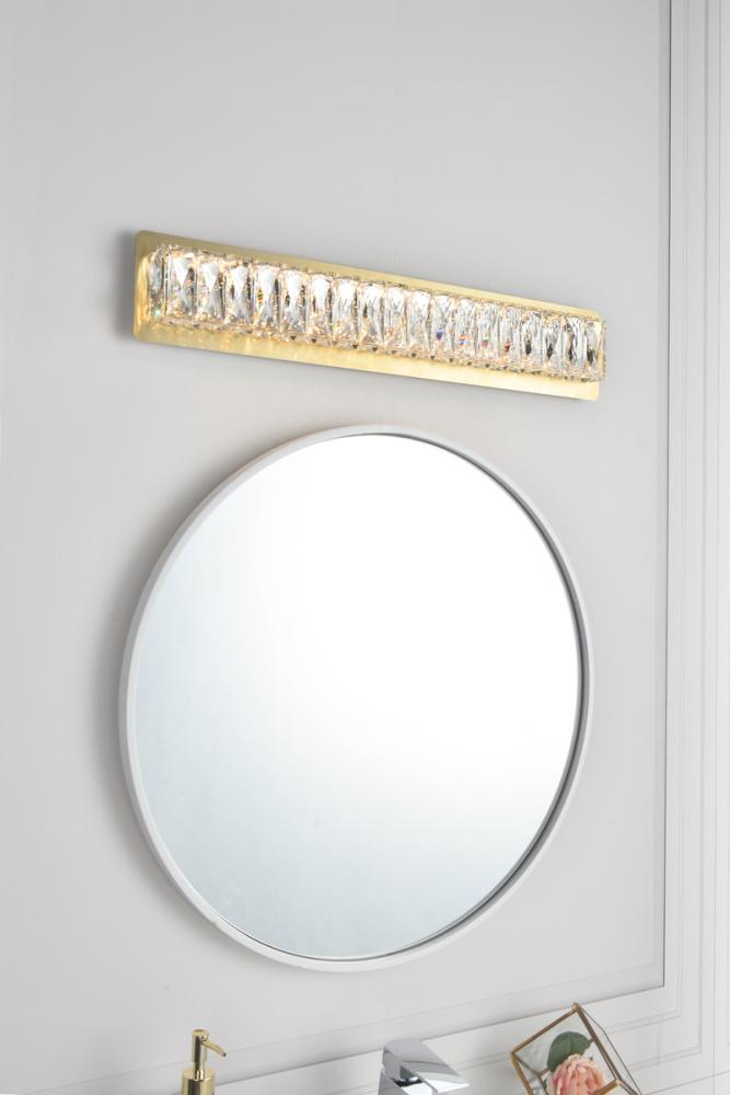 Monroe collection wall sconces dress up a bathroom, office, or bedroom without overwhelming the surrounding décor. A rectangular stainless-steel frame and backplate would seem austere if it weren’t covered by a row of shining rectangular royal-cut clear crystals. The gold-finished backplate is polished to a mirror shine and reflects the glittering crystals for additional sparkle. Available in three size options with a sleek gold finish that completes this modern look.