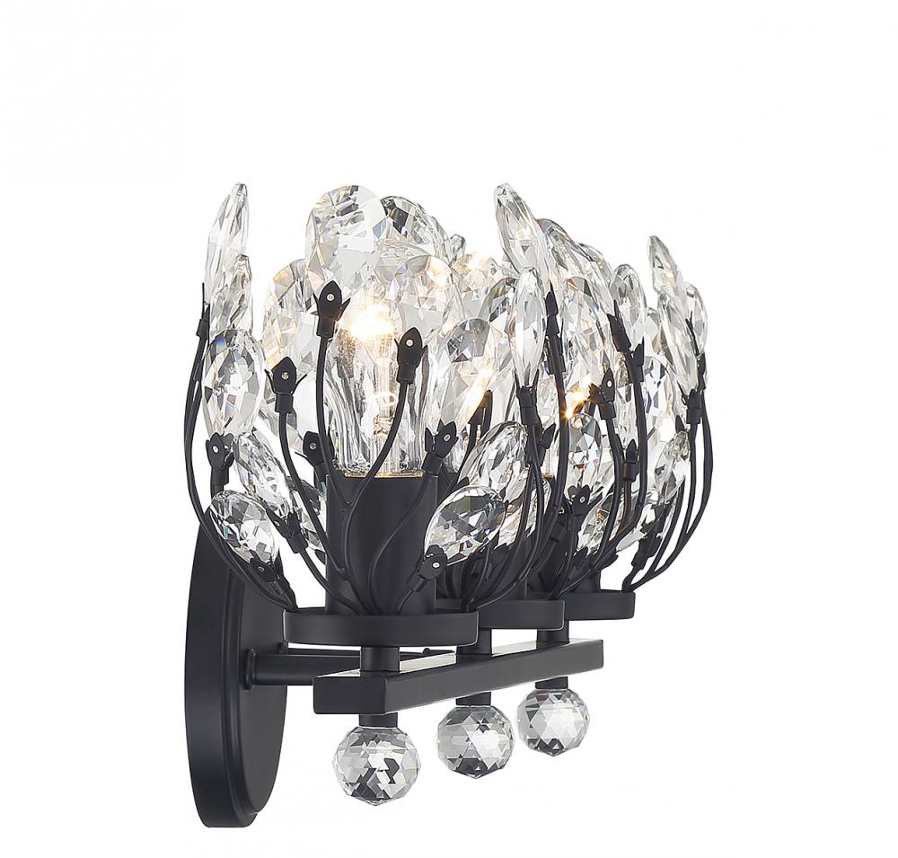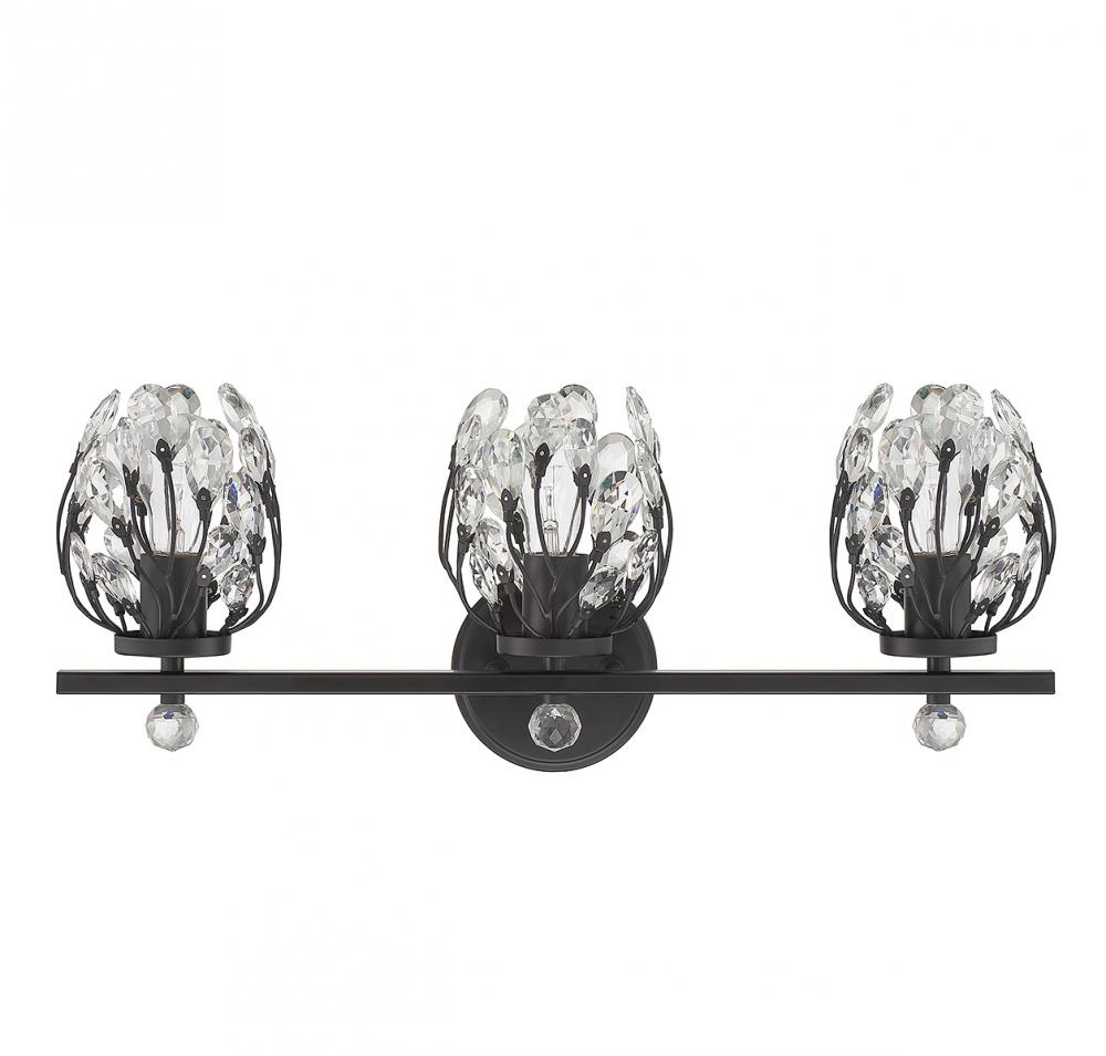 Give your bathroom its flowers with the whimsical Savoy House Moreno 3-light bath vanity light. Metal stems topped with clear crystal buds surround each light to create a look that is always fresh and fun, whether the lights are on or off. Finished in matte black. Moreno is 9.5" in height, 23.5" in width and extends 6.75" from the wall. It uses 3 standard size bulbs of up to 60 watts per bulb (bulbs not included).