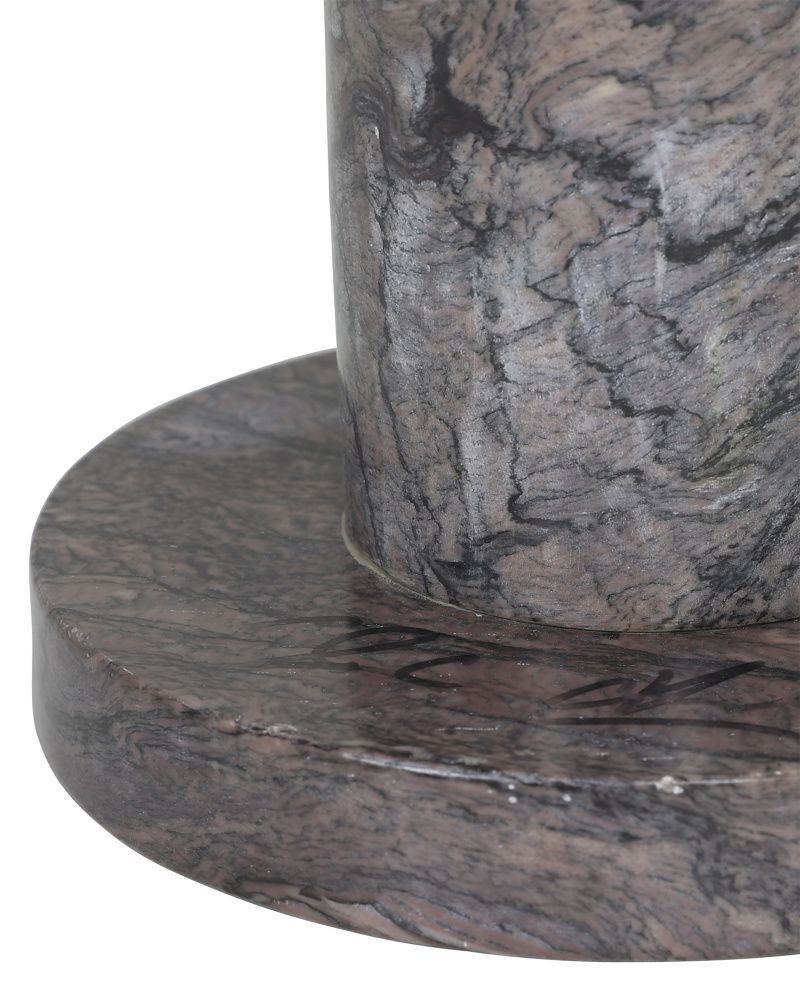 The Moreno Drinks Table is made of Rosa Cappuccino Marble, Camello Neve Marble, and Breccia Marble. The geometric sculptural piece has tremendous personality because of the veining of the marbles. The surfaces of the table will vary from piece to piece given it is made of natural stone. The Moreno has a glass top with double bevels.