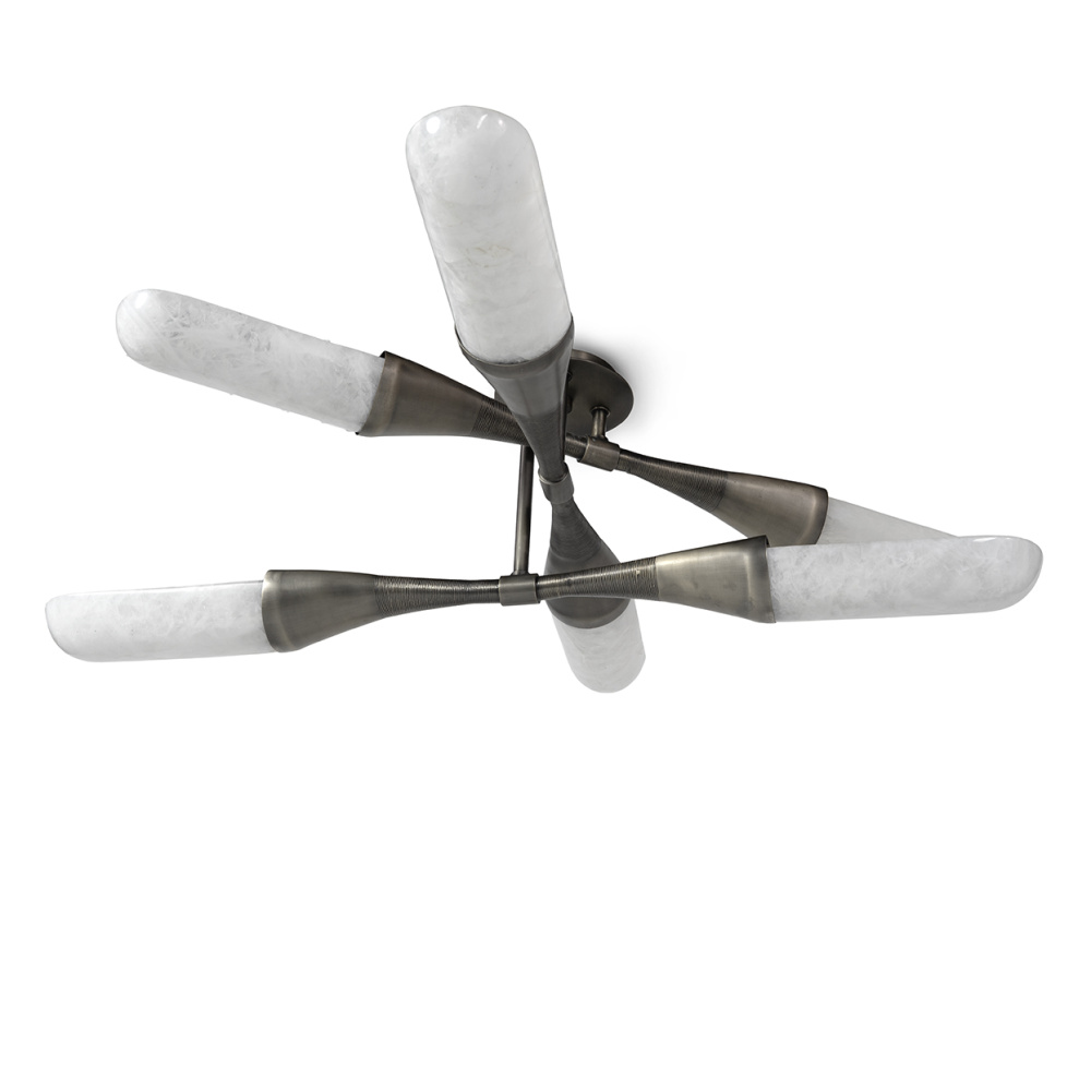 Semi flush mount features white alabaster shades accented with textured white bronze details and canopy hanging kit. Professional installation is recommended. Coordinates with the Naomi collection.