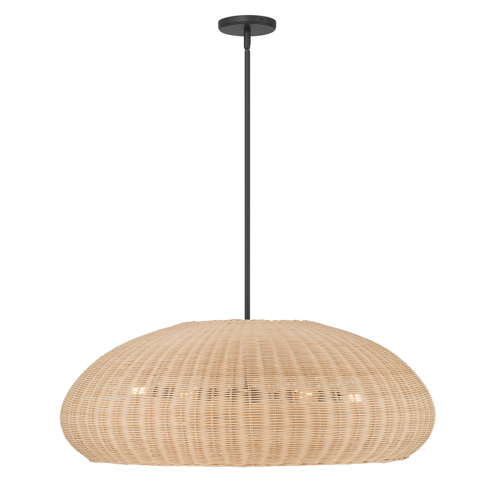 Evocative of delightful 1960’s lighting profiles, the Natora Collection of pendant lighting is the definition of contemporary Bohemian Chic. Natural tone wicker mushroom shaped shades are delicately suspended from a steel metal bar, finished in understated matte black, creating the perfect ambiance for any interior space. A cheerful addition to vintage or modern décor and available as a 5 or 6-light pendant.