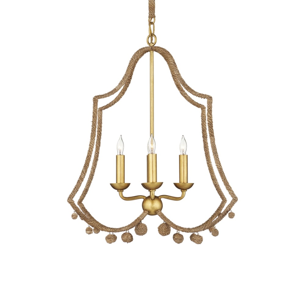 New in the Suzanne Duin Collection, the Nimes Chandelier is infused with the inimitable French flair she is known for. Both the double-bell shape and the ornamental balls that dangle from the bottom of the scallops express the quintessential charm for which the South of France is renowned. The frame, made of wrought iron in a contemporary gold leaf finish, is partially wrapped in natural Lampakanay rope, as are the tiny globes that hang beneath it. Adjustable from 27.5" to 76.5" with use of included chain/rod kit/cable. If your space calls for a longer drop, additional chain/rods/cable is available for purchase.