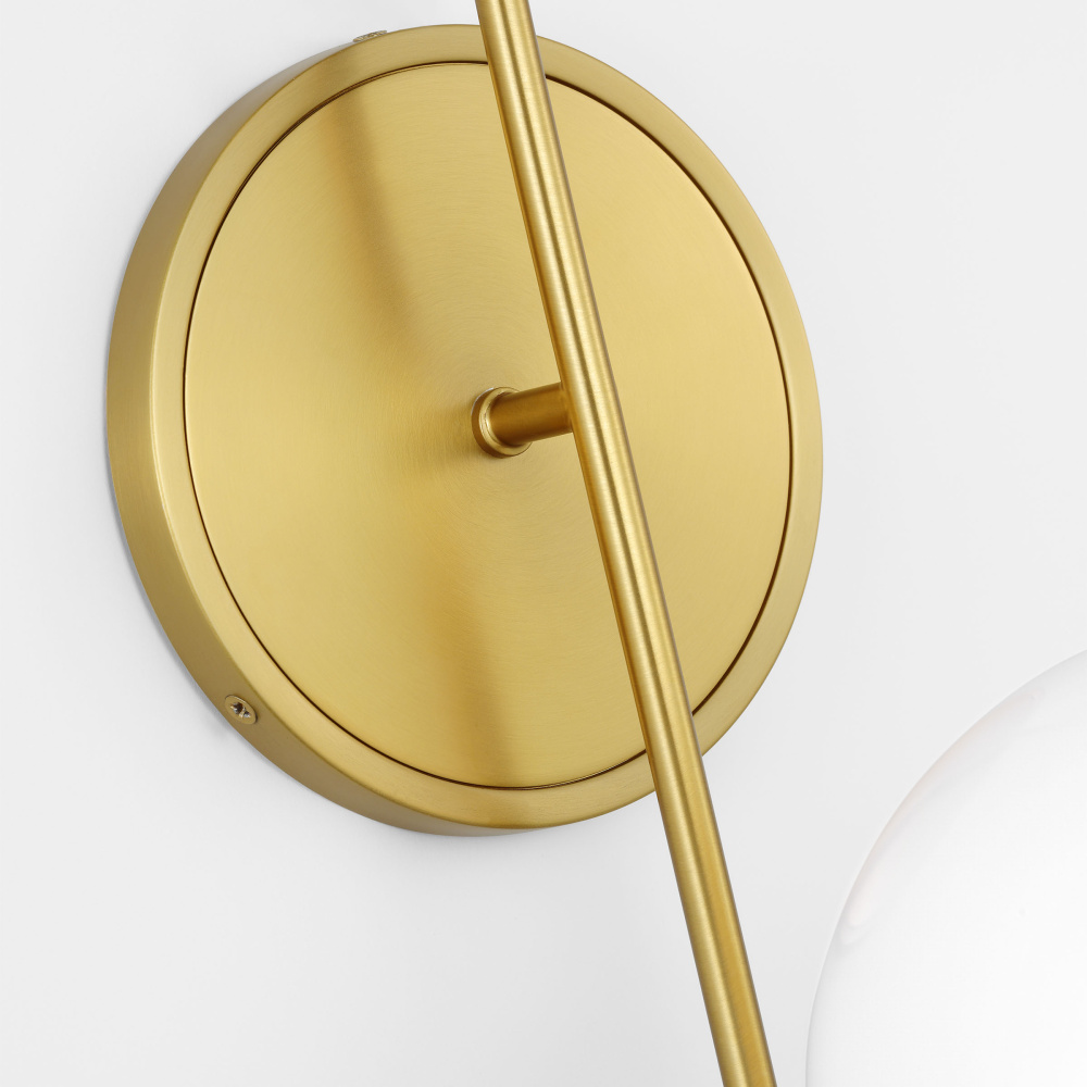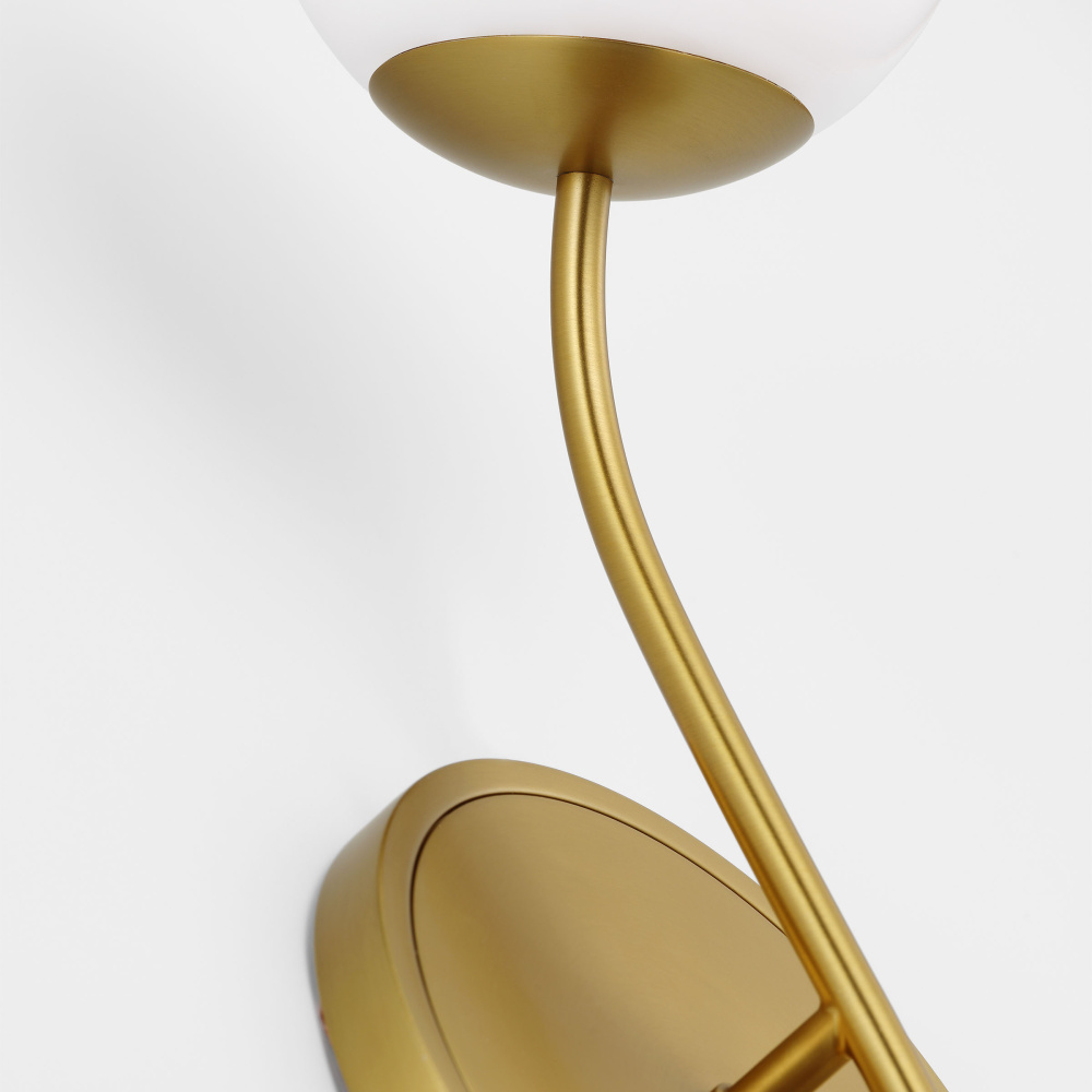The Noemie two-light wall sconce by kate spade new york perfectly balances a glass globe and curving teardrop frame, giving it a contemporary look. The white glass casts a soft, welcoming glow over a space. This piece works particularly well in a hallway.