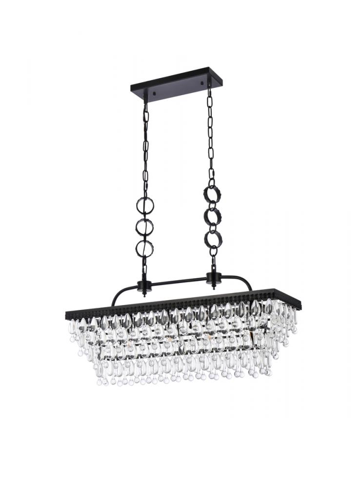 Like the sun setting on a frozen lake, this collection shimmers with tiers of icy crystals reflecting the soft glow of the candelabras. True to its Nordic namesake, the cascades of clear crystals complement the etched metal frame. Suspended by an elegantly looped chain that draws the eye to the cool sheen below. Perfect to place over your dining table.