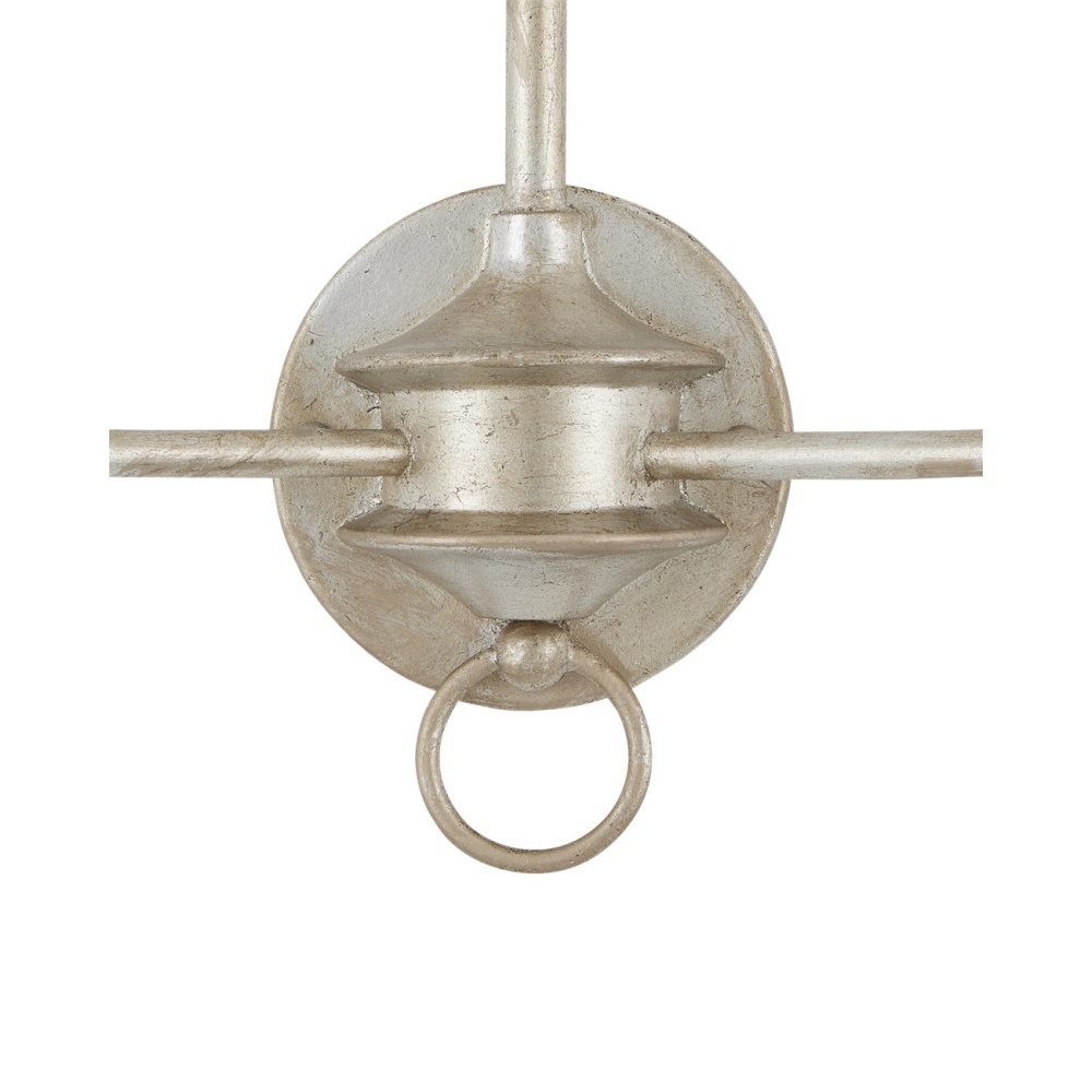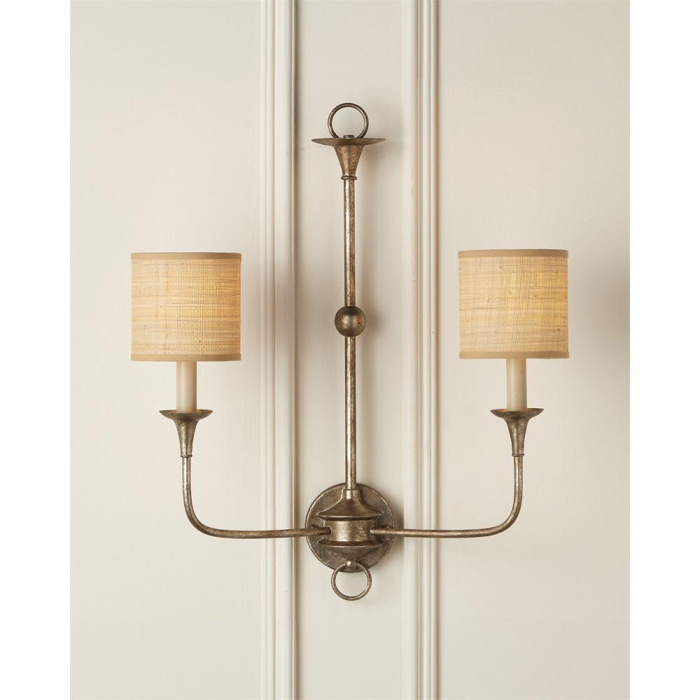 The arms of the Nottaway Champagne Large Wall Sconce stretch gracefully from a half-spool shape that rests at the bottom of its stem, ornamented with a dainty ring. Though this is a seriously minimalist fixture, the profile of the silver wall sconce has a lovely fluidity to it that also makes it a natural choice for traditional and transitional interiors. The champagne finish on the wrought iron frame adds a very subtle textural interest.