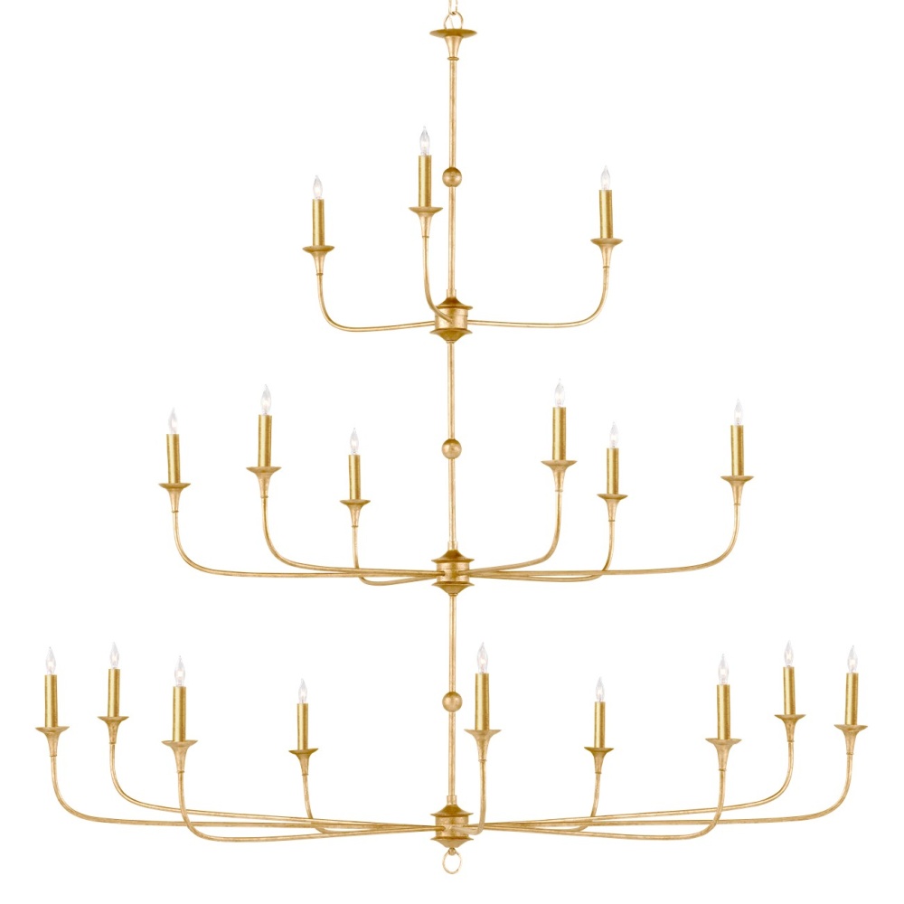 The arms of the Nottaway Grande Gold Chandelier stretch gracefully from petite cogs that rest at the bottoms of its stems, the bottom one ornamented with a dainty ring. Though this is a seriously minimalist fixture, the profile of the gold chandelier has a lovely fluidity to it that makes it a natural choice for traditional and transitional interiors. The contemporary gold leaf finish on the wrought iron frame adds textural interest. Adjustable from 70" to 138" with use of included chain/rod kit/cable. If your space calls for a longer drop, additional chain/rods/cable is available for purchase.