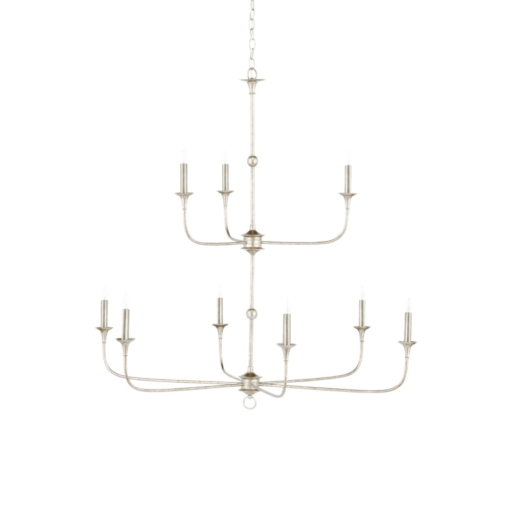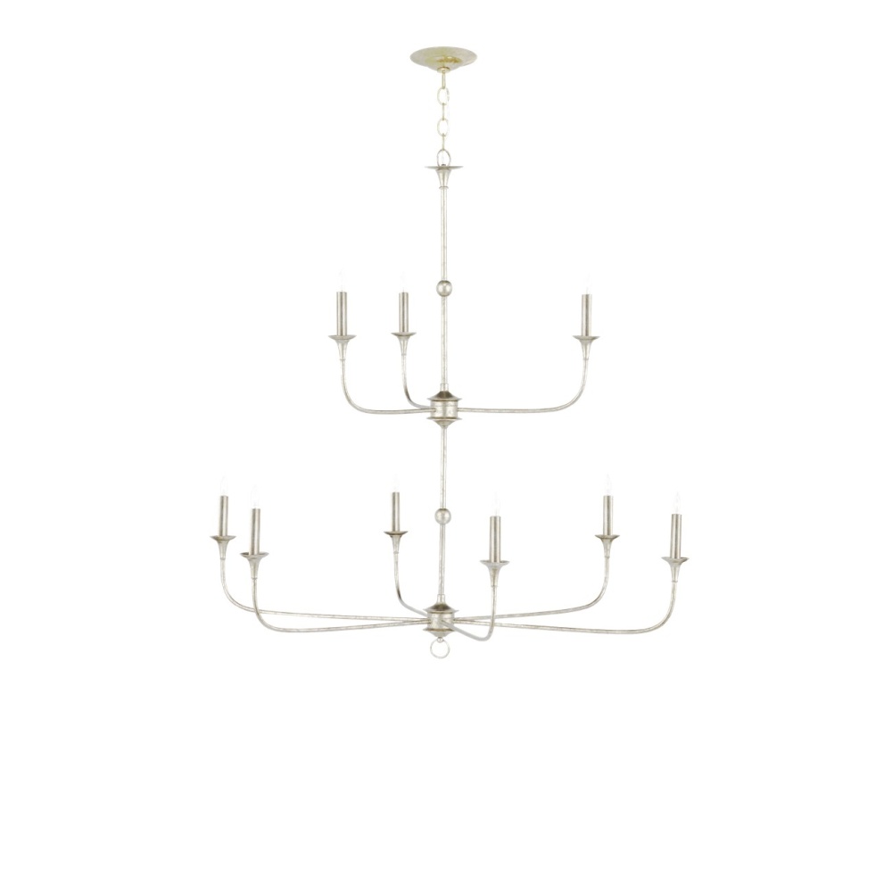 The arms of the Nottaway Two-Tier Champagne Chandelier stretch gracefully from petite cogs that rest at the bottoms of its stems, the bottom one ornamented with a dainty ring. Though the silver chandelier has minimalist lines, there is a sweeping fluidity to its profile that makes it a natural choice for large tall foyers or any room with high ceilings. The finish on the wrought iron frame brings textural interest to this dimmable nine-light fixture. Adjustable from 51" to 119" with use of included chain/rod kit/cable. If your space calls for a longer drop, additional chain/rods/cable is available for purchase.
