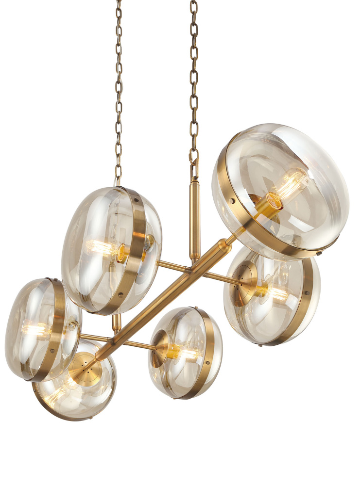 A band encircles each glass orb that beautifully reflects a warm glow from the vintage lights within. The metal support creates an inviting counterpoint to the austere design