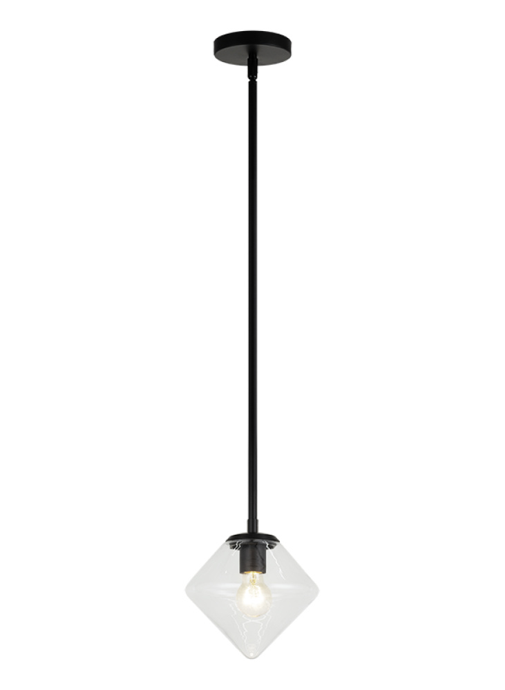 Novo is modern yet classic – available in the form of pendant, chandelier, wall sconce, and flush mount. The rods and base are either Aged Gold Brass or Black finish paired with a contrasting Opal or Clear round glass and diamond shaped glass. The style is very versatile and will add beauty to multiple rooms.