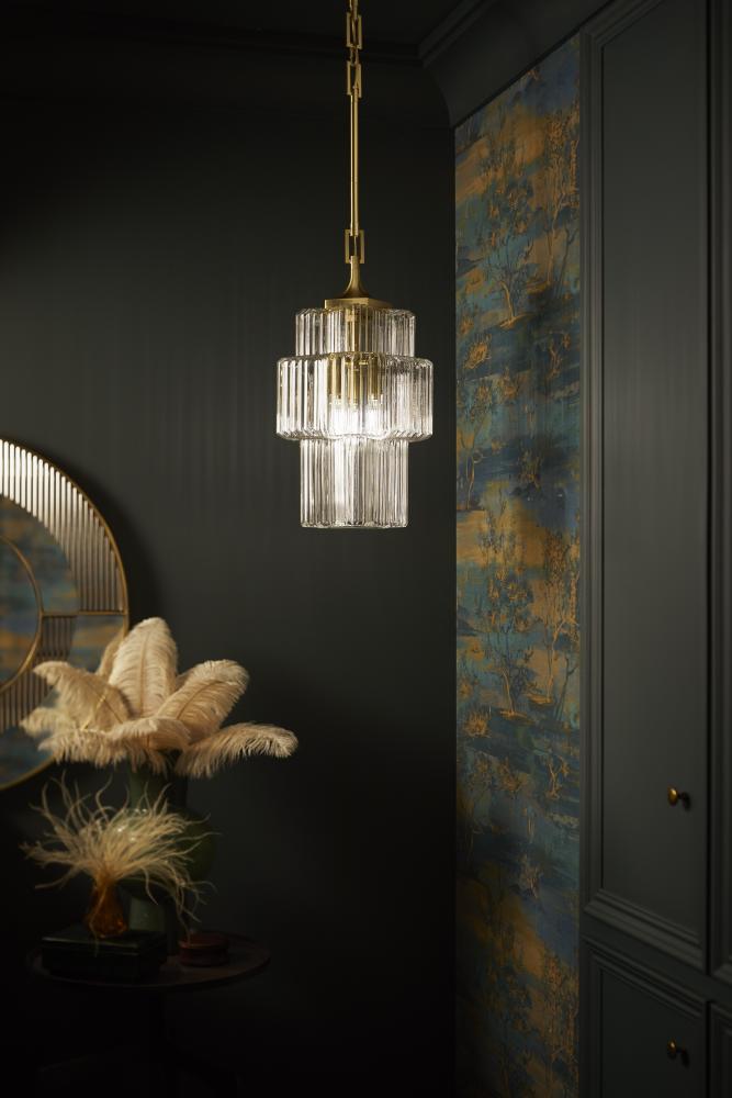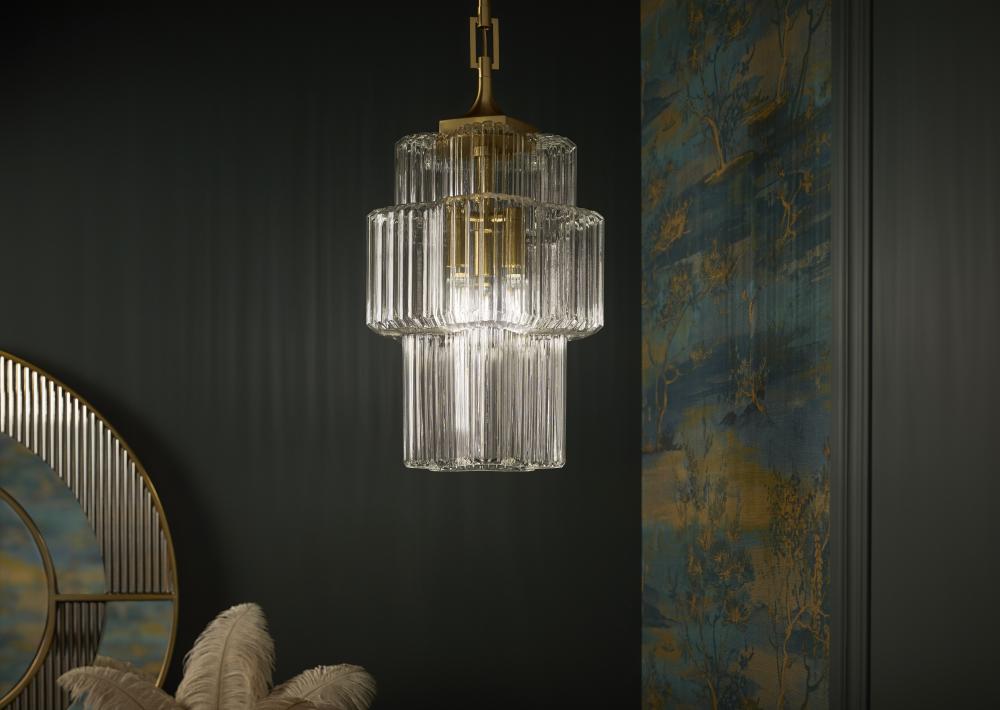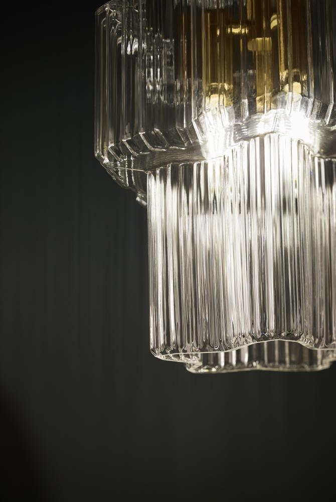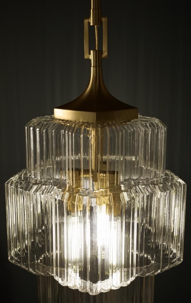 Ridged cylindrical glass shades combine with faceted metals in vintage-inspired fixtures elegant enough for any room
