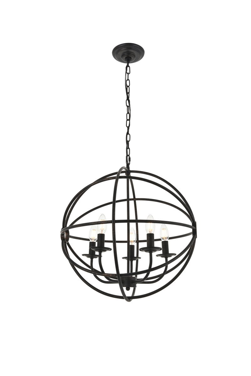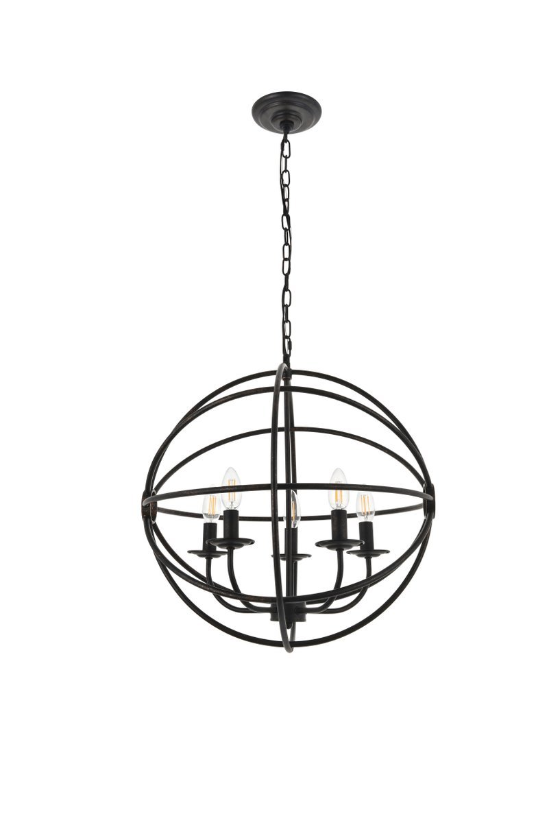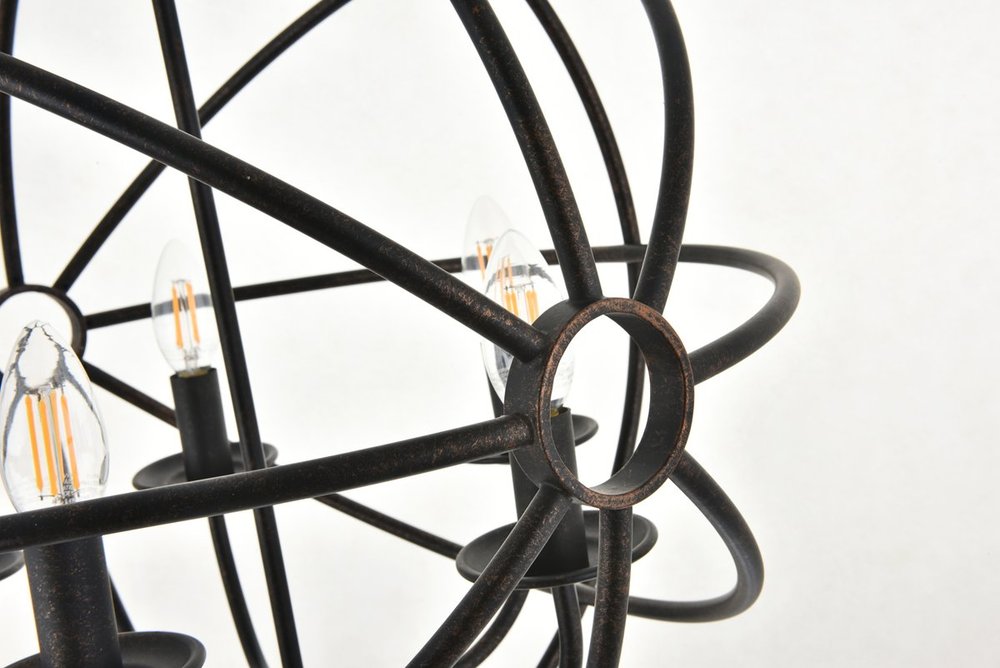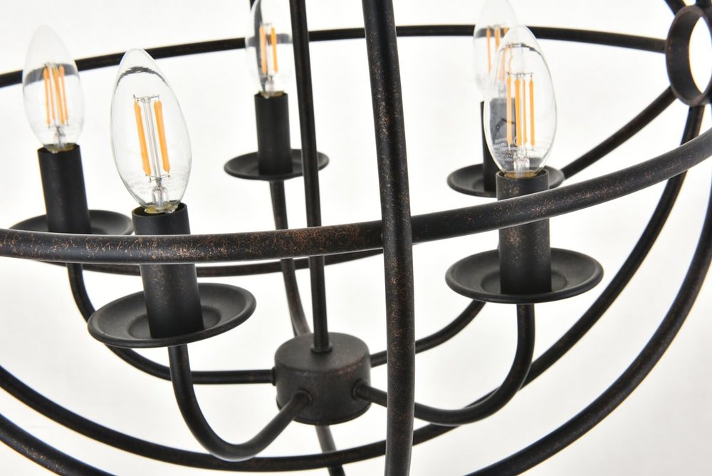 Dark brown finish open gyroscopic frame with 5 candelabra styled lights within, giving off an old world charm