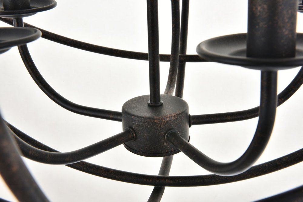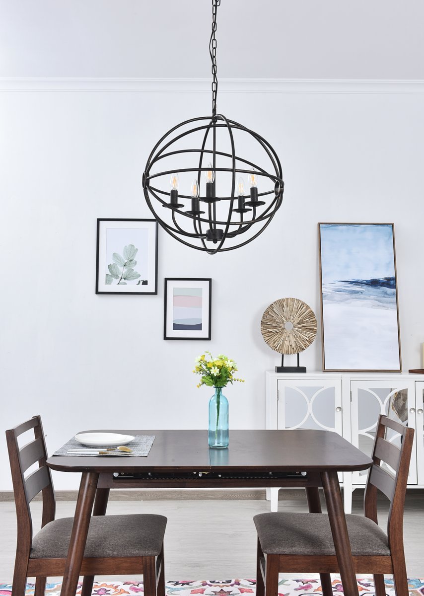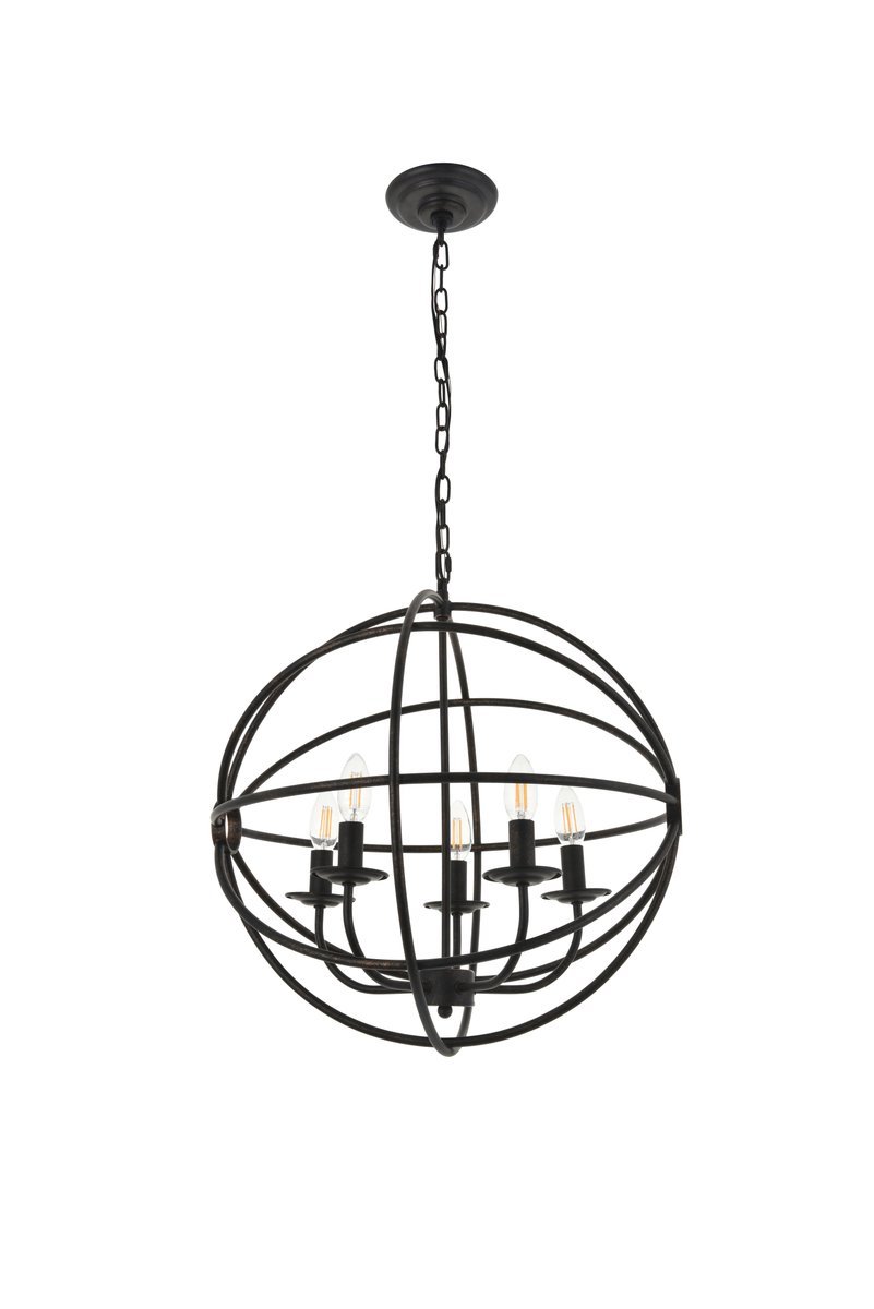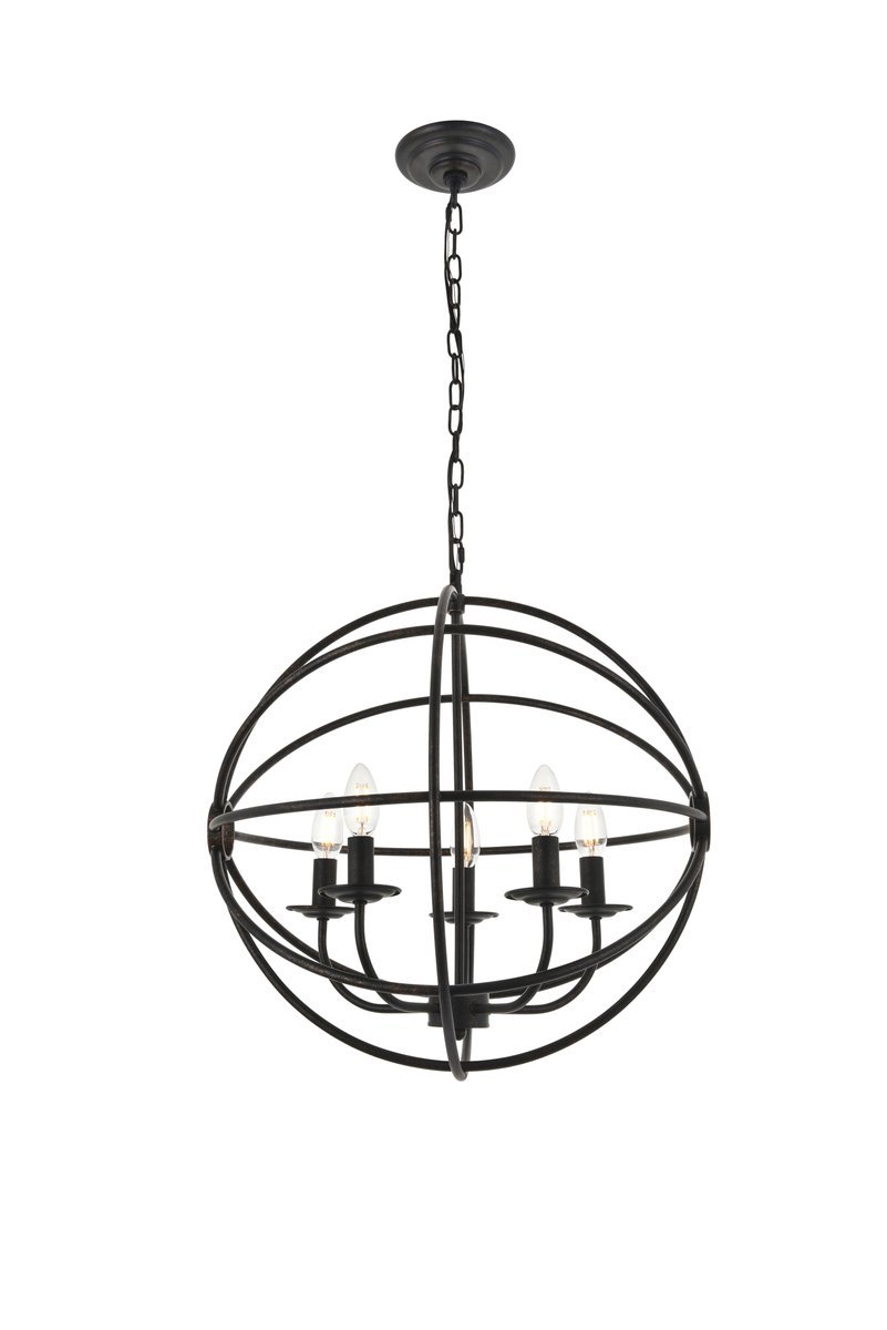 Dark brown finish open gyroscopic frame with 5 candelabra styled lights within, giving off an old world charm