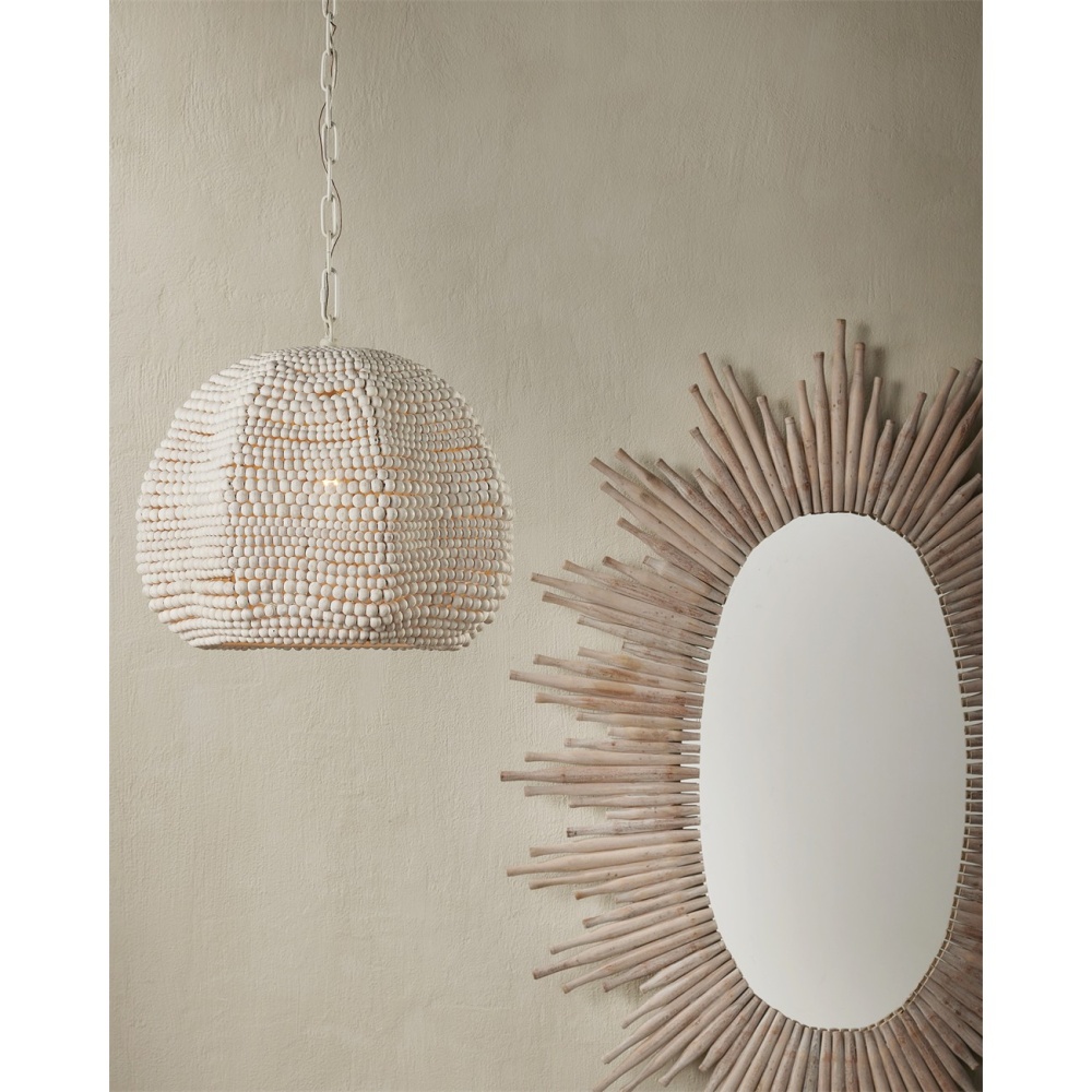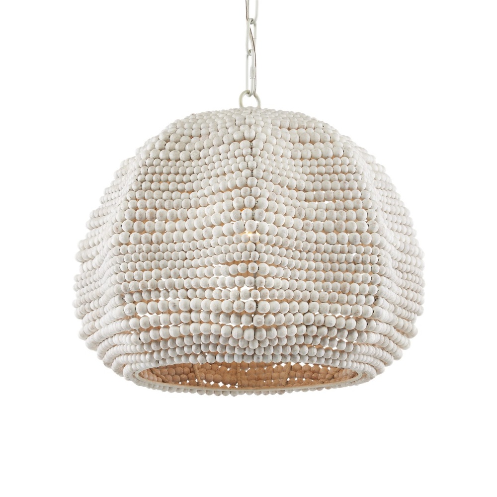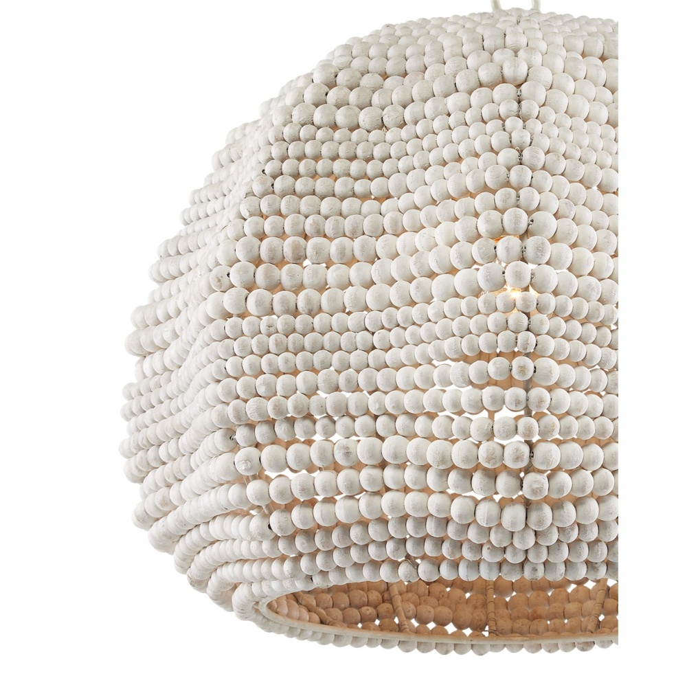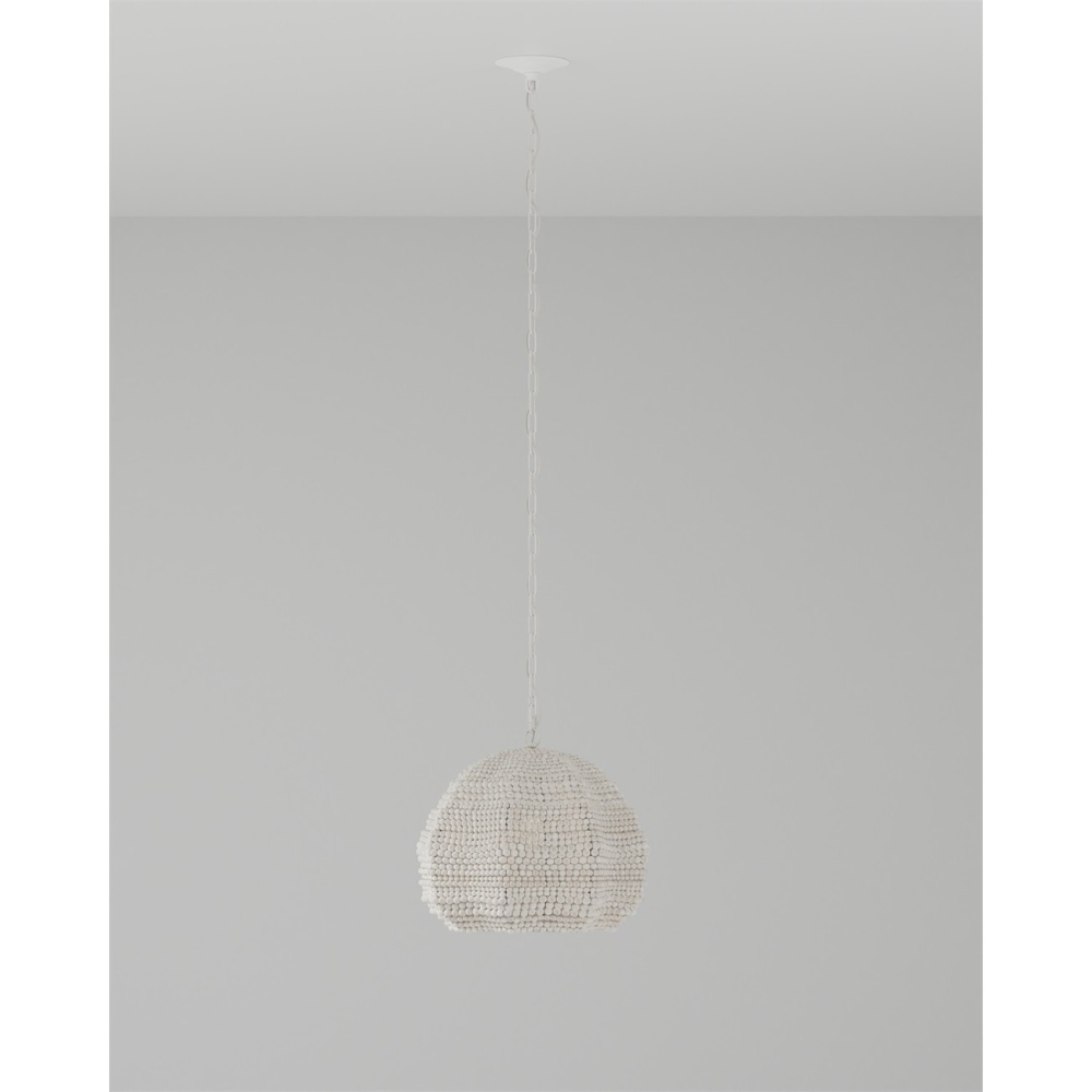 The Octavia White Pendant has a flowing profile made of wood beads that have been whitewashed and strung along metal wire so that the shape will remain whimsical. This white pendant fits perfectly within the coastal design aesthetic that is sought after for interiors. The desire for casual elements that hold up to the highest design standards is driving this movement. Adjustable from 20" to 90.5" with use of included chain/rod kit/cable. If your space calls for a longer drop, additional chain/rods/cable is available for purchase.
