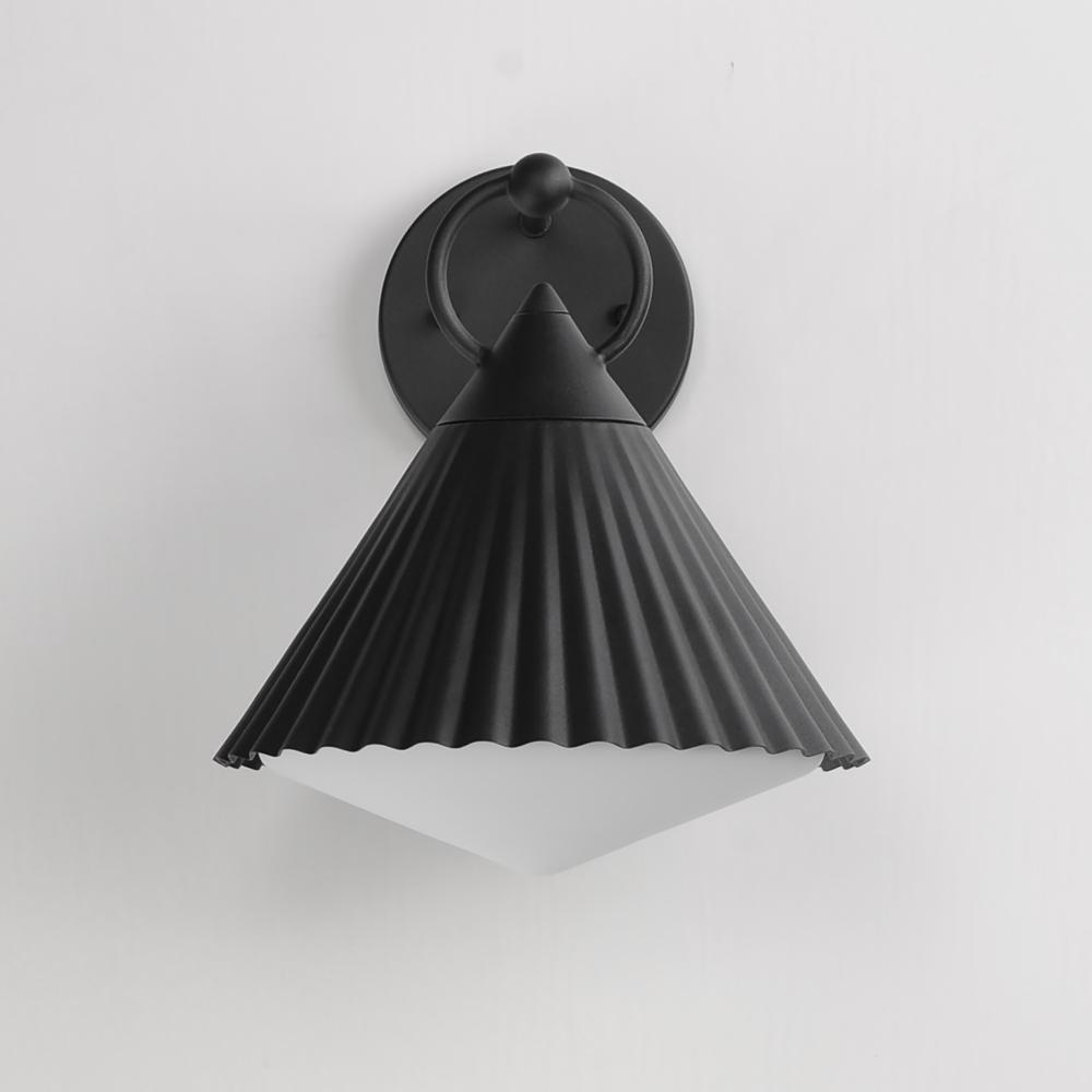 Adding charm to the outdoors, the Odette series features a scalloped pyramid shade suspended from a ring of Die Cast Aluminum. Supported within the shade is an inverse pyramid that peaks out beneath the hem of the aluminum shade marrying the two pyramid fo