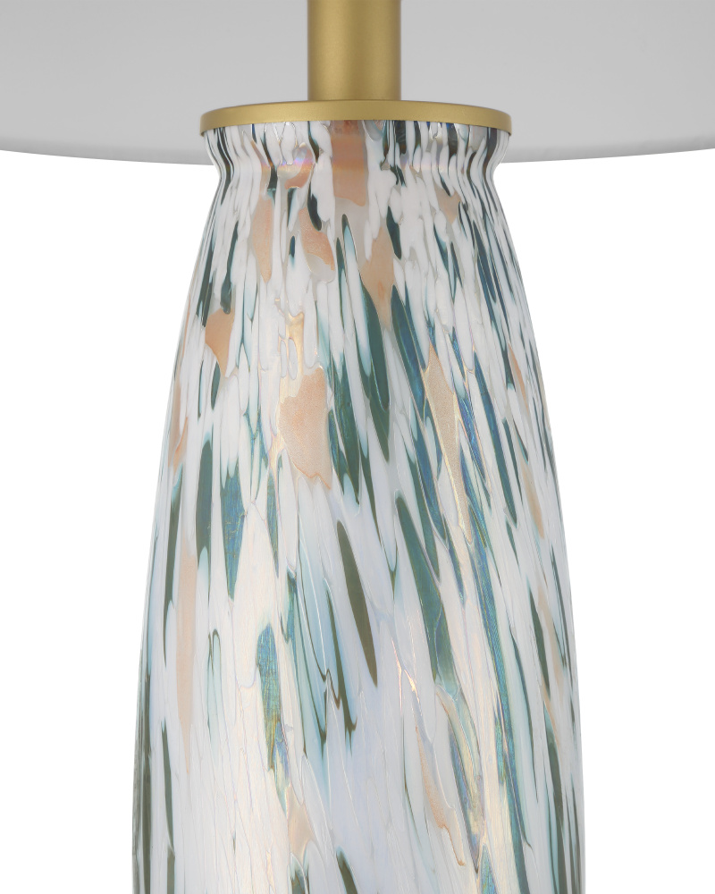 The color of the Olive Green Table Lamp brings warmth to the bottle-shaped body given it is made of transparent glass. The metal rod that runs through it to connect the hardware to the base is in an antique brass finish, as is the understated square base with a coordinating lip that cradles the glass form. This is a tall lamp at 33.5 inches from the base to the antique brass finial that fastens a pale empire shade to it.