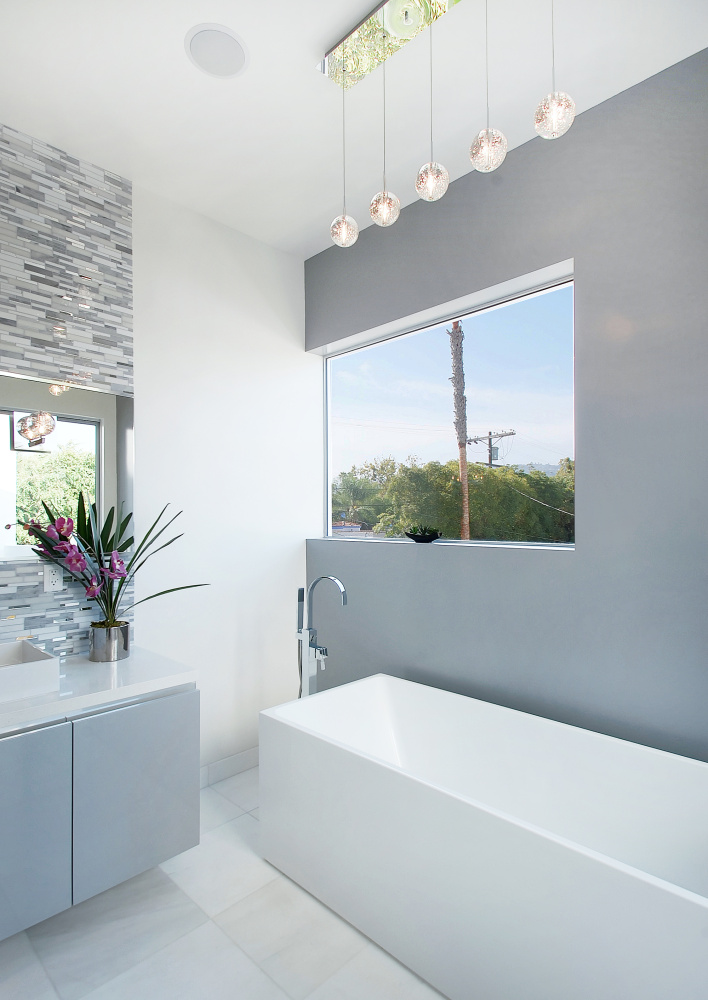 Ablaze with xenon lamps radiating from the center of perfect spheres, the Orb Collection adds a sense of drama to any room. Clear bubble glass allows for a lustrous glow as light mimics the fluid play of water and air. Bordered with a Polished Chrome frame