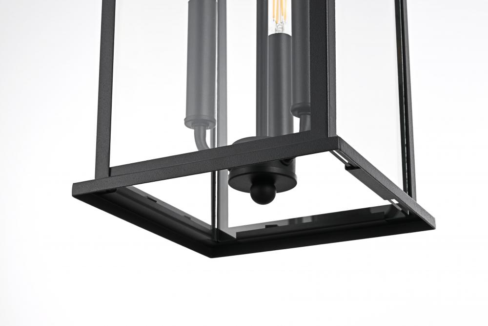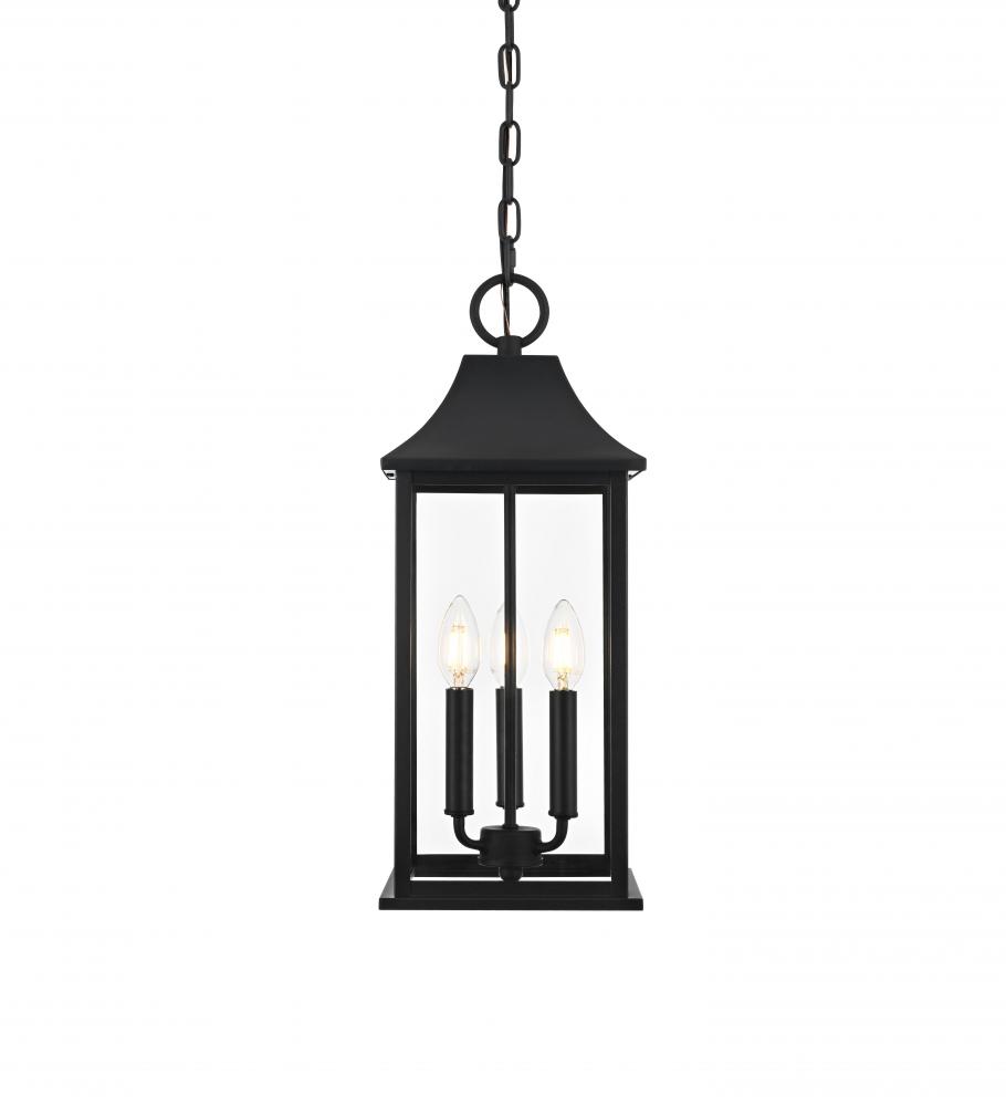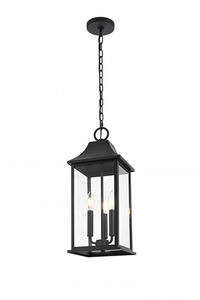 Add a striking centerpiece to your outdoor space with this exquisite hanging pendant light. Crafted from durable iron and clear glass, its tall, rectangular lantern design with a gracefully tapered roof exudes classic sophistication. The three candelabra-style bulbs offer a warm, radiant glow, amplified by the clear glass panels. Suspended by an adjustable matte black chain, this pendant light is as functional as it is visually captivating, making it an ideal choice for entryways, patios, or porches. Its weather-resistant build ensures it remains a standout feature season after season.