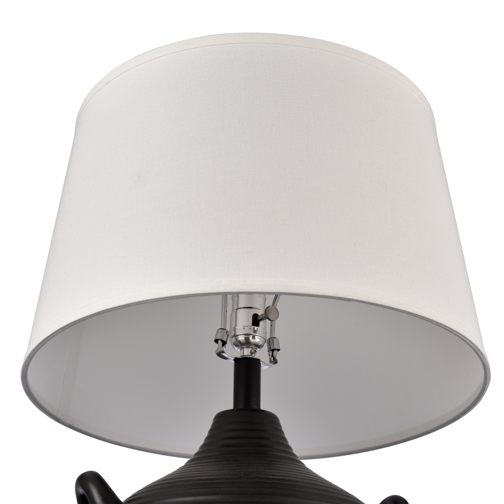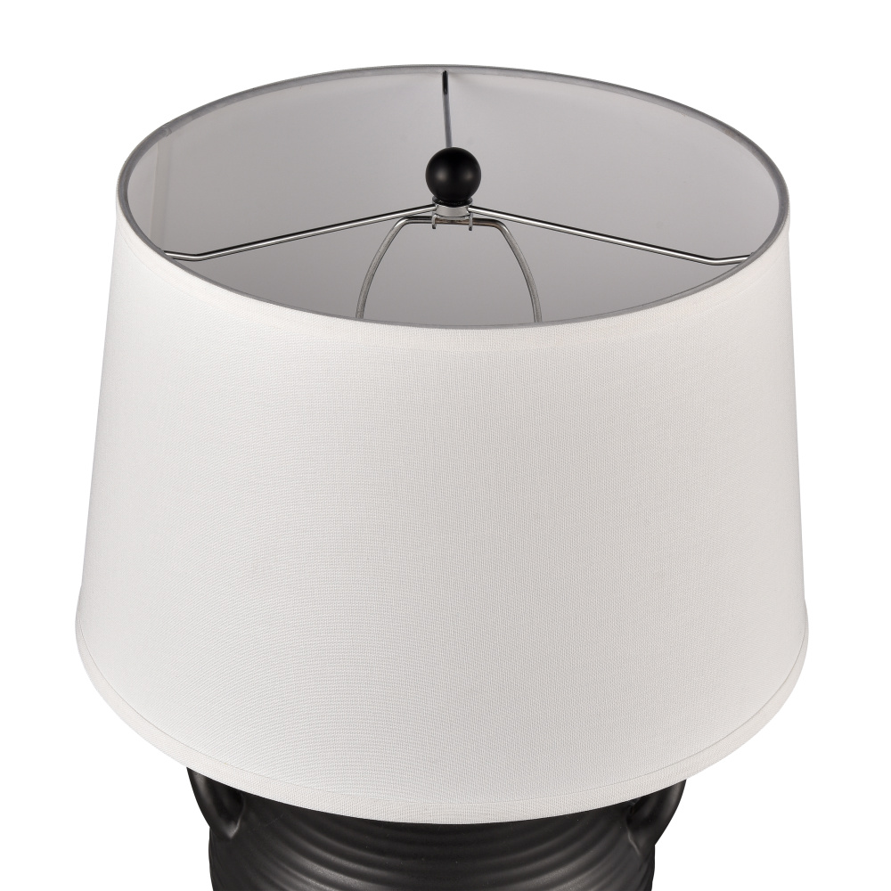 The Oxford Table Lamp has a traditional rounded urn-shaped earthenware base with two small handles. This versatile lamp comes in a glossy finish with a ribbed texture, making it an ideal choice for a modern farmhouse or coastal setting. The lamp is finished in a round white linen shade.