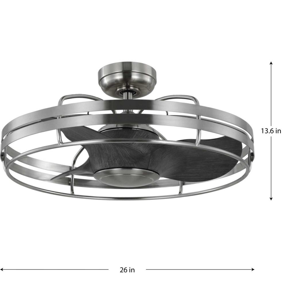 Three curved ABS fan blades for better air movement, blades are hand finished in a Grey Weathered Wood with an outer cage finished in smooth Brushed Nickel