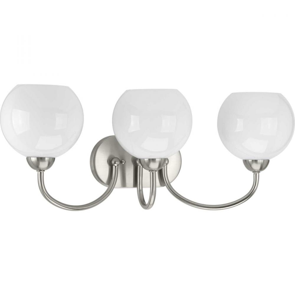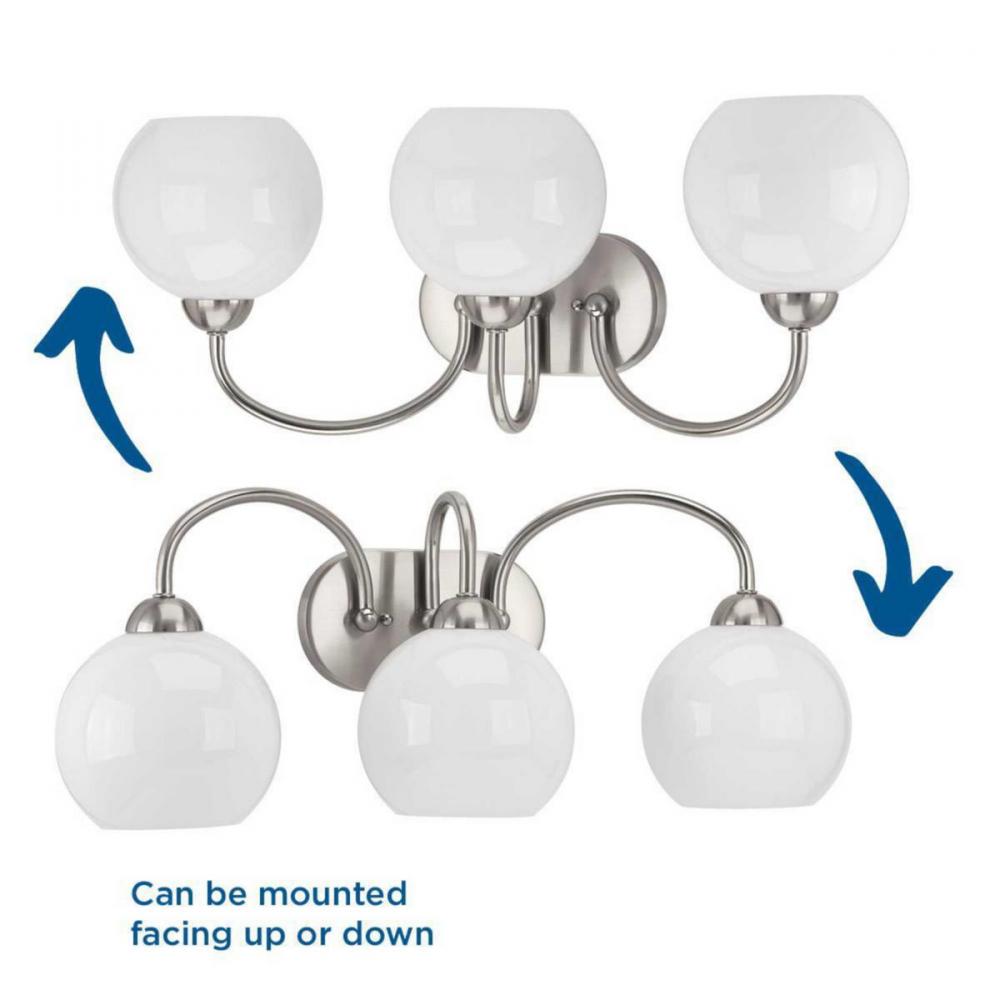 Ideal for a bathroom;Perfect for mid-century modern and modern style settings;Beautiful brushed nickel finish;Elegant opal glass shades;Mount the light fixture facing up or down;Use 3 medium base bulbs that are sold separately (75 W max - LED/CFL/incandesc