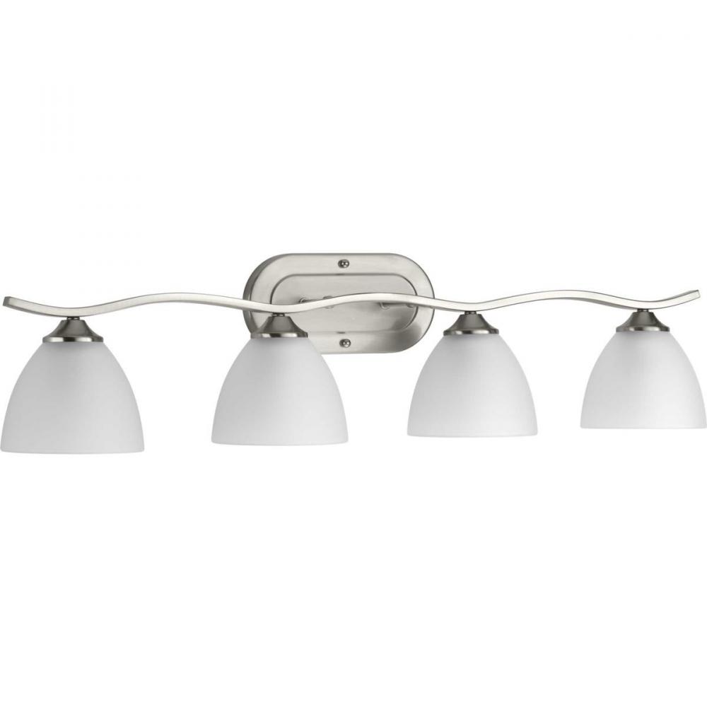 Ideal for a bathroom;Perfect for traditional and transitional style settings;Beautiful brushed nickel finish;Elegant etched glass shades;Mount the light fixture facing up or down;Use 4 medium base bulbs that are sold separately (100 W max - LED/CFL/incande