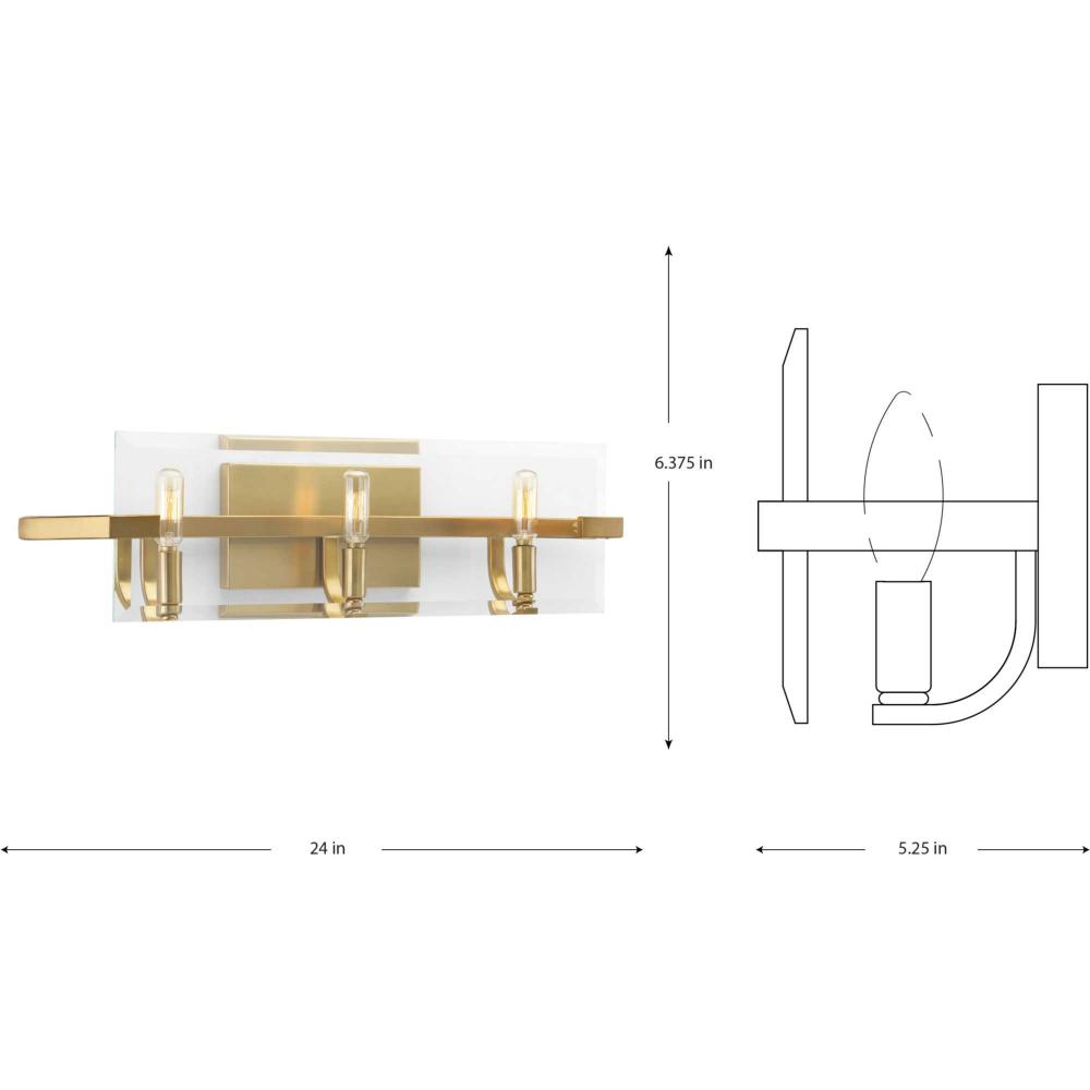Ideal for a bathroom;Perfect for luxe, mid-century modern, and modern style settings;Golden brushed bronze finish;Crisp clear beveled glass shade;Includes installation instructions and mounting hardware;Use 3 candelabra base bulbs that are sold separately