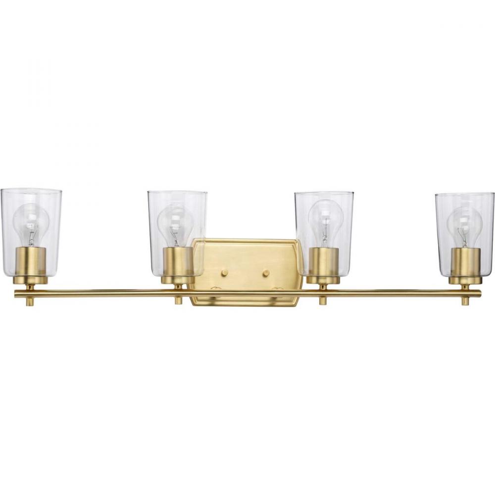For the ultimate ambient lighting experience for bathroom or vanity setting that seeks illumination, look no further than the Adley four-light bath. A Satin Brass, curved backplate and simple, straight bar hold classic, clear glass shades, making it an excellent choice for new traditional and transitional settings.
