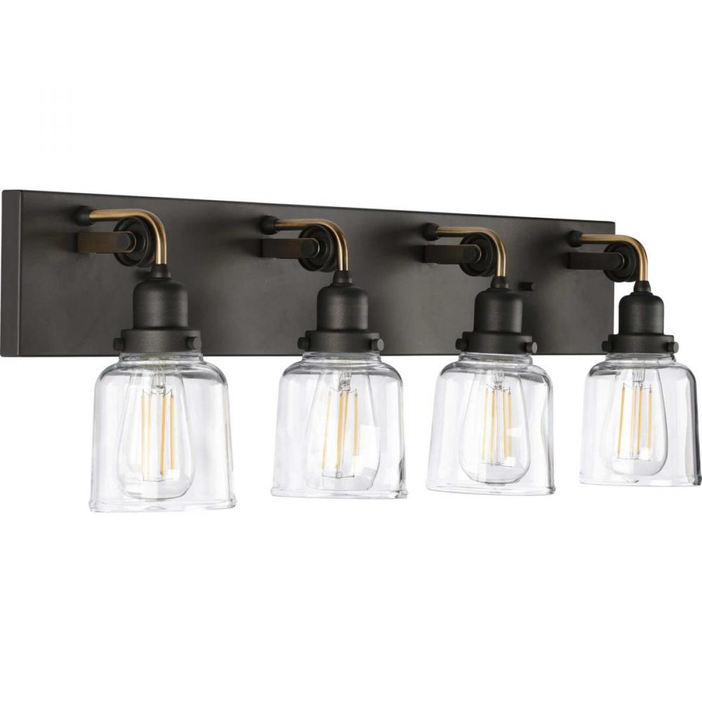 The Rushton four-light bath winks at its antique roots with steampunk-inspired pulley wheels supporting Antique Brass tube arms that join the light sources to the Graphite-finished backplate. Four sibling exposed glass bulbs hang in linear fashion, each sheathed with a clear glass shade securely held by antique-style sockets. A stunning, quintessential piece perfect as a bath vanity or wall sconce in industrial and farmhouse settings.