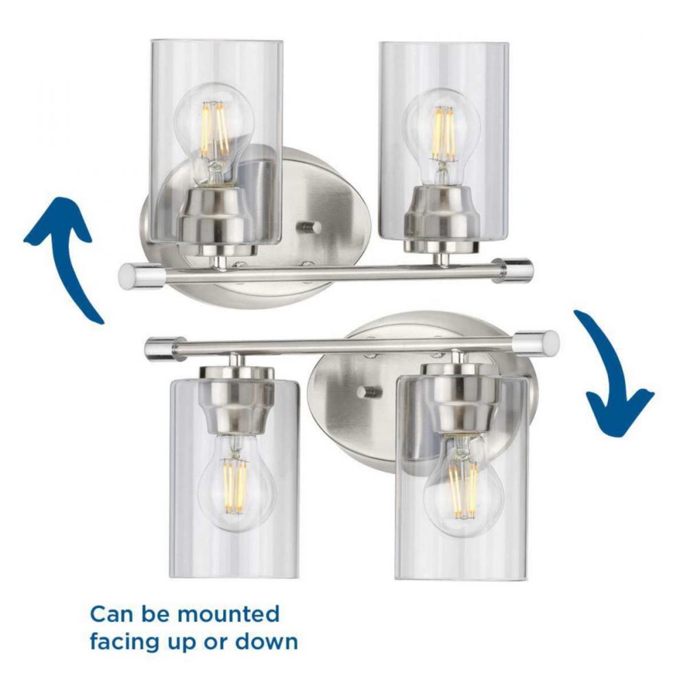 Incorporate a sleek simplicity and natural beauty with the Riley Collection's Two-Light Brushed Nickel Bath. Clear glass shades offer rejuvenating illumination. The shades rest on a gorgeous brushed nickel frame with polished chrome finials for an overall design that exudes a feeling of tranquility and serenity.
