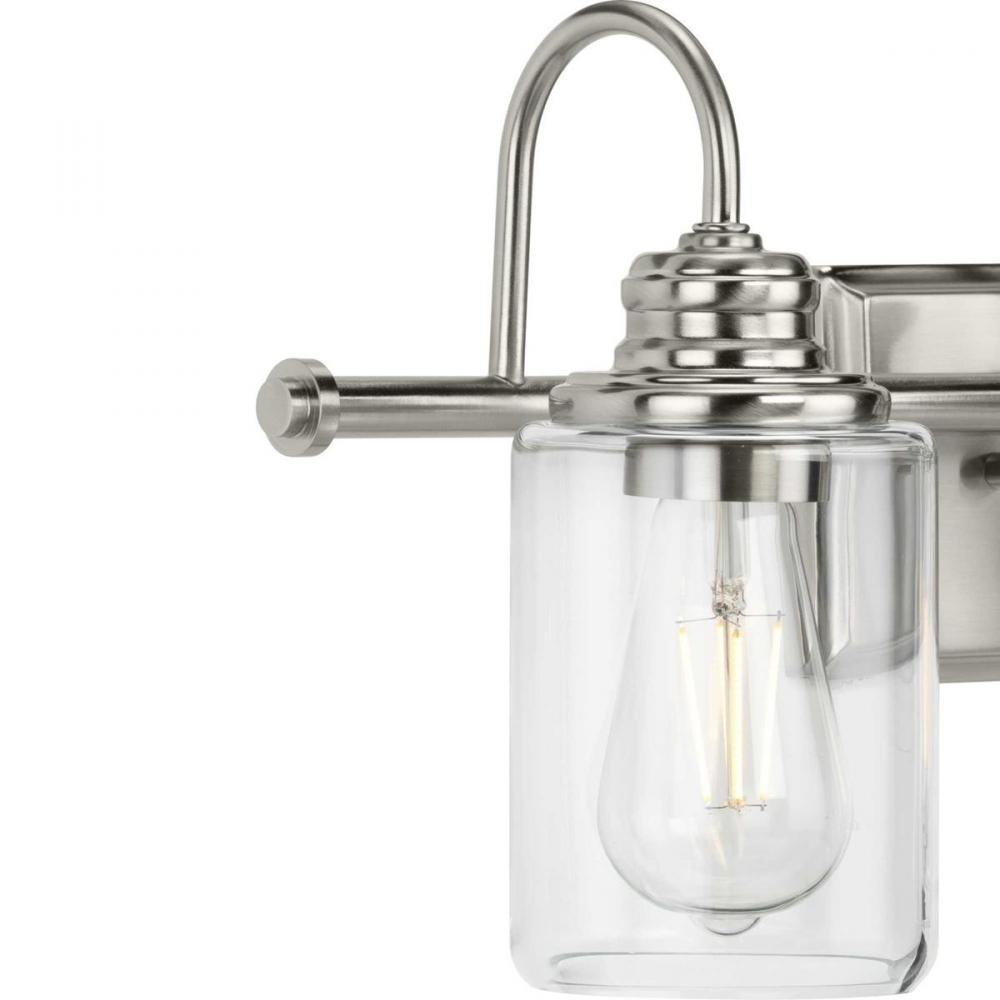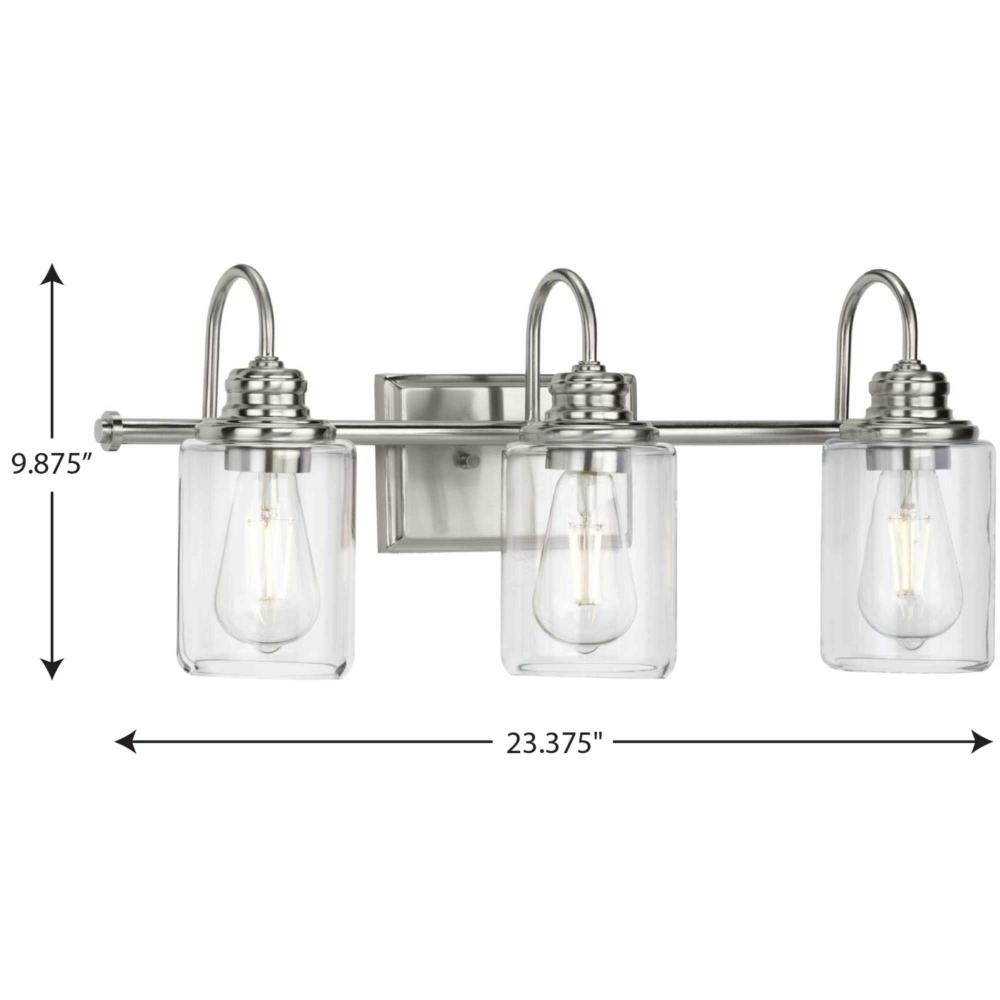 Application: Ideal for any bathroom.;Style: Perfect for farmhouse and transitional style settings.;Finish: The beveled backplate, curved arms, and decorative vintage light bases are coated in a beautiful brushed nickel finish that will transform any bath f