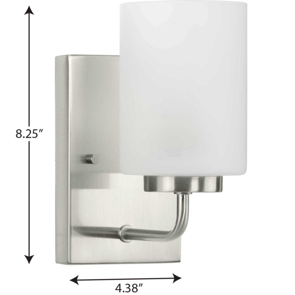 Incorporate a clean, contemporary design with the Merry Collection 1-Light Etched Glass Brushed Nickel Transitional Bath Vanity Light. Light sources glow from within crisp etched glass shades for a generous elegant glow sure to transform any bath into a modern retreat. The rectangular backplate, curved arms, and round light bases are coated in a beautiful brushed nickel finish that perfectly blends transitional and modern character. For ideal illumination, use 1 medium base bulb that are sold separately (100w max - LED/CFL/incandescent). The bath light is compatible with dimmable bulbs. The bath vanity light's contemporary design is ideal for any bathroom in modern and transitional style settings. It's time to breathe new life into the mundane every day with timeless and truly transformative lighting. Make your purchase today to begin your journey to a whole new lighting experience. Progress Lighting products are designed for exceptional quality, reliability, and functionality.