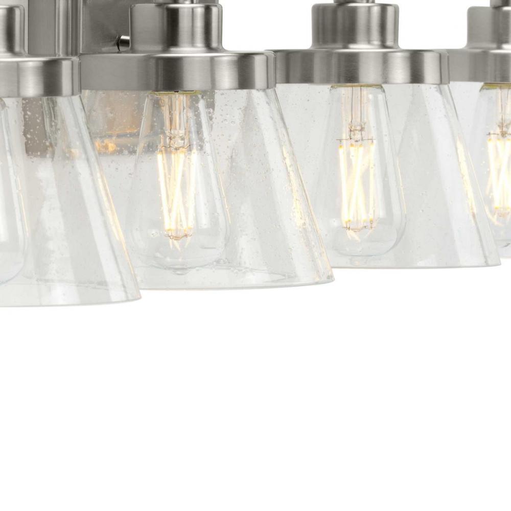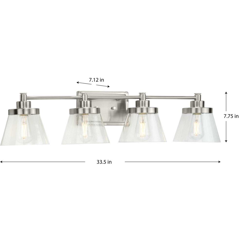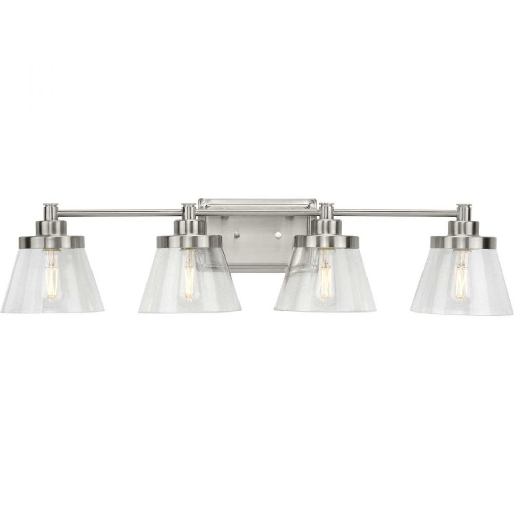 Ideal for a bathroom;Perfect for farmhouse and transitional style settings;Beautiful brushed nickel finish;Clear seeded glass;Mount the light fixture facing up or down;Uses 4 medium base bulbs that are sold separately (60 W max - LED/CFL/incandescent);Meas