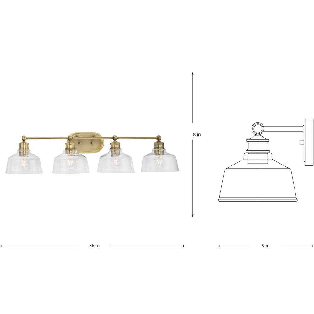 The Singleton Collection 4-light vanity fixture pays homage to industrial styling with oversized warehouse shades fabricated from clear glass. A round backplate and vintage-inspired metal fittings finished in soft vintage brass create a timeless design. Place above the vanity mirror for optimal task lighting in the bath. This versatile vanity light can be mounted up or down, casting even illumination in any setting.