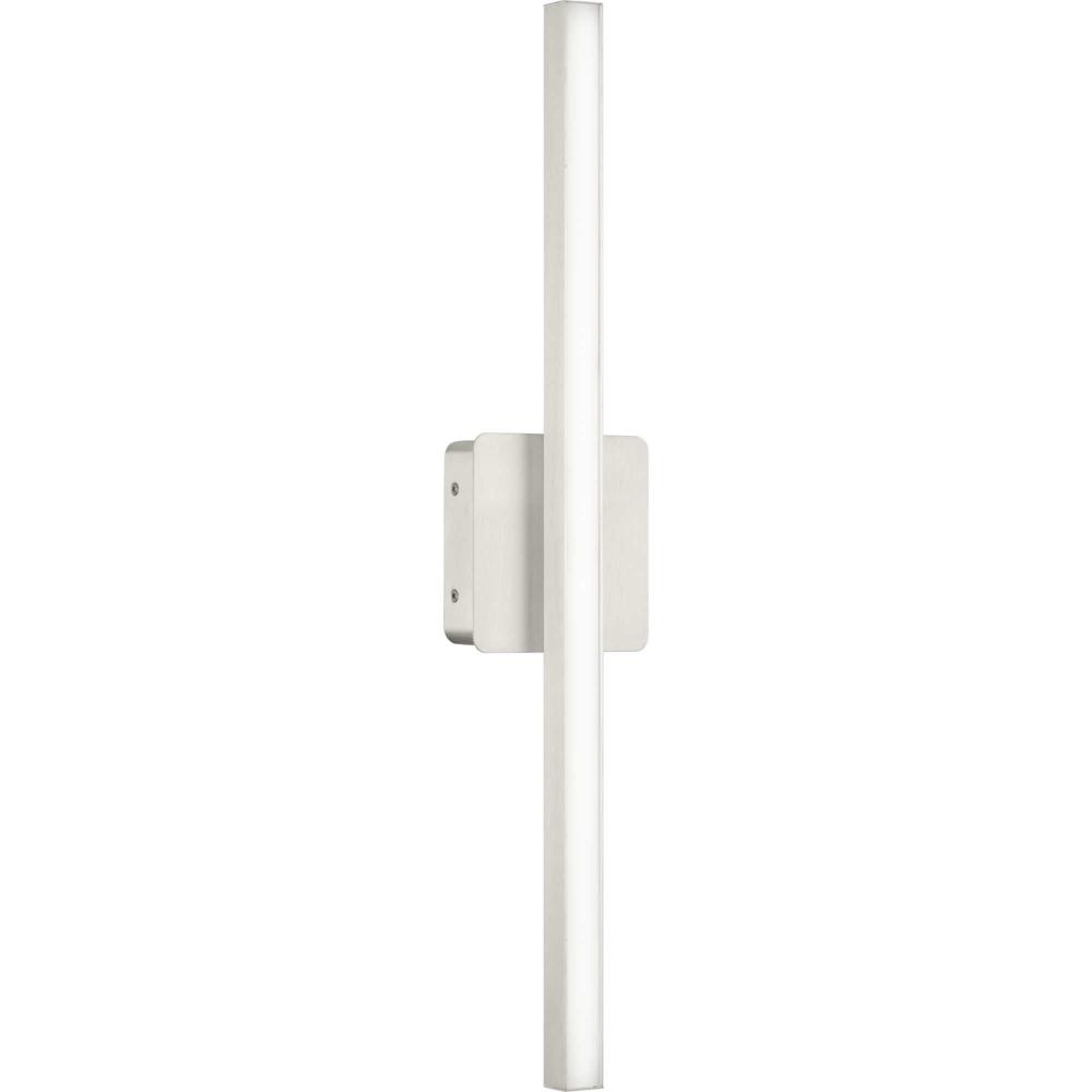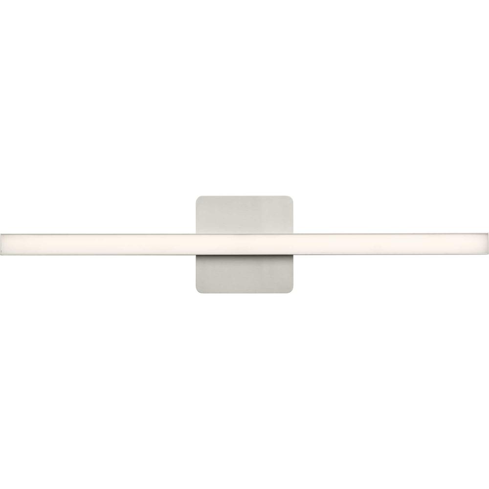 The Phase 4 Collection Medium LED Linear Vanity Light features color selectable technology and a sleek and minimal composition. A smooth square backplate finished in soft brushed nickel anchors the fixture, supporting a slim rectangular acrylic shade that creates a soft, uniform and energy-efficient light at 3000K, 4000K or 5000K. This versatile luminaire can be mounted as a wall sconce or as a vanity light above sinks and vanities, lending its surroundings a tailored touch. The bath light's versatile design is ideal for any bathroom in contemporary or modern commercial or residential settings. Progress Lighting products are designed for exceptional quality, reliability, and functionality.