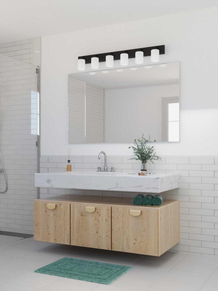 Incorporate a clean, contemporary design with the Merry Collection 6-Light Etched Glass Matte Black Transitional Bath Vanity Light. Light sources glow from within crisp etched glass shades for a generous elegant glow sure to transform any bath into a modern retreat. The rectangular backplate, curved arms, and round light bases are coated in a beautiful matte black finish that perfectly blends transitional and modern character. For ideal illumination, use 6 medium base bulbs that are sold separately (100w max - LED/CFL/incandescent). The bath light is compatible with dimmable bulbs. The bath vanity light's contemporary design is ideal for any bathroom in modern and transitional style settings. It's time to breathe new life into the mundane every day with timeless and truly transformative lighting. Make your purchase today to begin your journey to a whole new lighting experience. Progress Lighting products are designed for exceptional quality, reliability, and functionality.