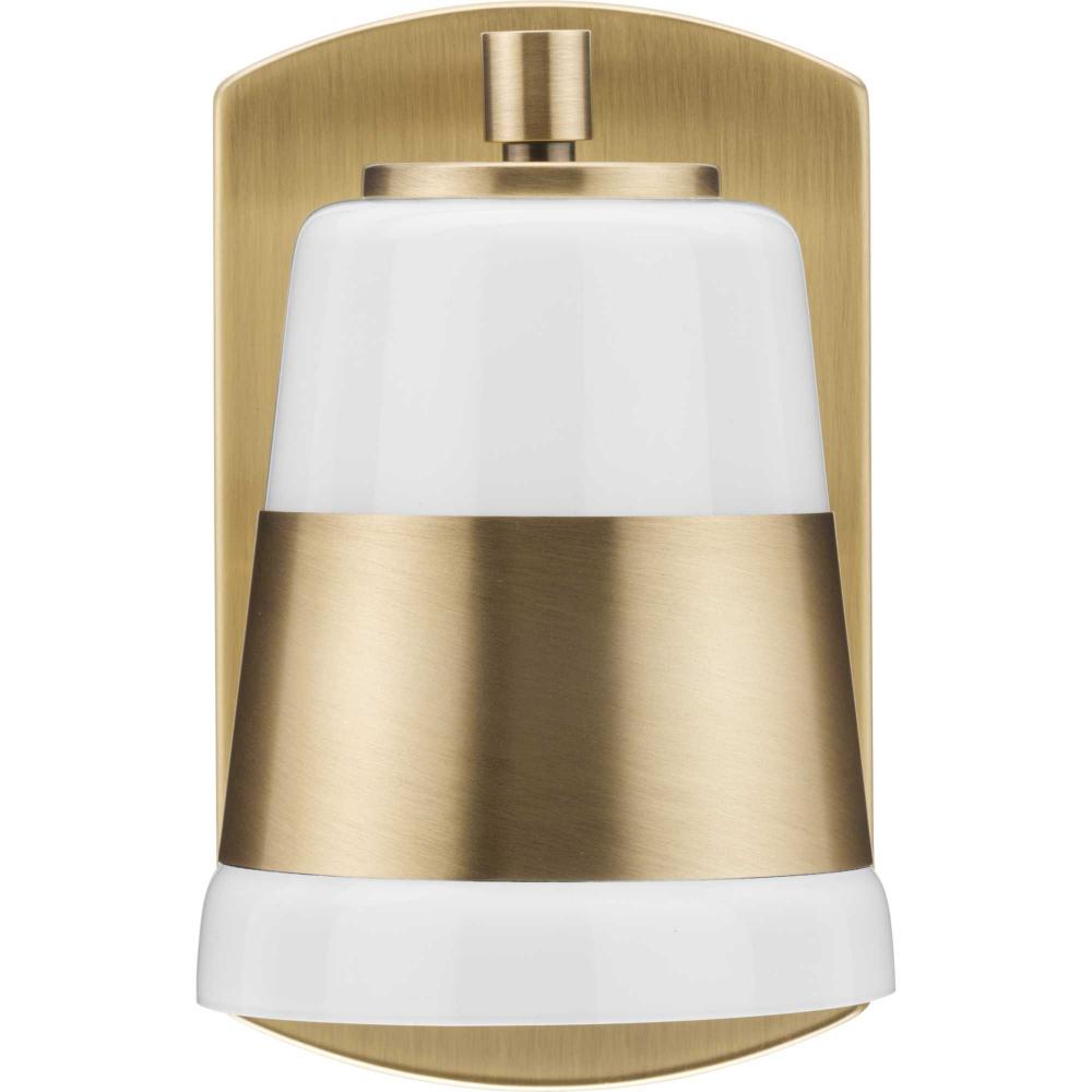 The Haven Collection is practical and stylish with a modern color blocking silhouette that fits perfectly in luxe industrial and contemporary rooms. The metal frame is finished in elegant vintage brass and features a shade suspended from an oblong backplate. Etched opal glass casts a pleasing, softened glow in bathrooms, powder rooms, hallways and living rooms. This versatile fixture can be mounted up or down, increasing its design flexibility. It is cULus damp location listed, with a one-year warranty to guarantee your complete satisfaction. Progress Lighting products offer exceptional quality, reliability, and functionality.