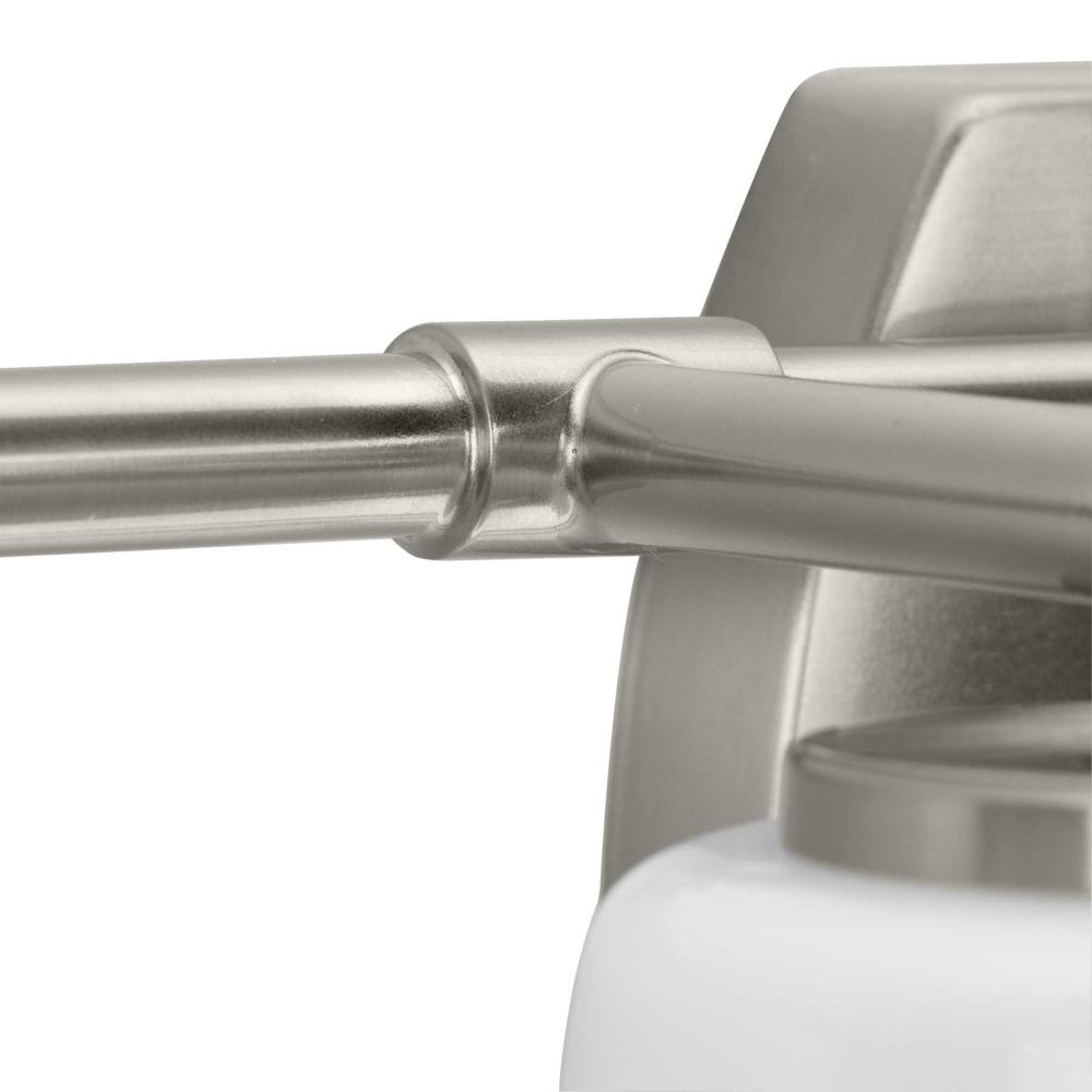 The Haven Collection is practical and stylish with a modern color blocking silhouette that fits perfectly in luxe industrial and contemporary rooms. The metal frame is finished in subtle brushed nickel and features shades suspended from an oblong backplate. Etched opal glass casts a pleasing, softened glow in bathrooms and powder rooms. This versatile fixture can be mounted up or down, increasing its design flexibility. It is cULus damp location listed, with a one-year warranty to guarantee your complete satisfaction. Progress Lighting products offer exceptional quality, reliability, and functionality.