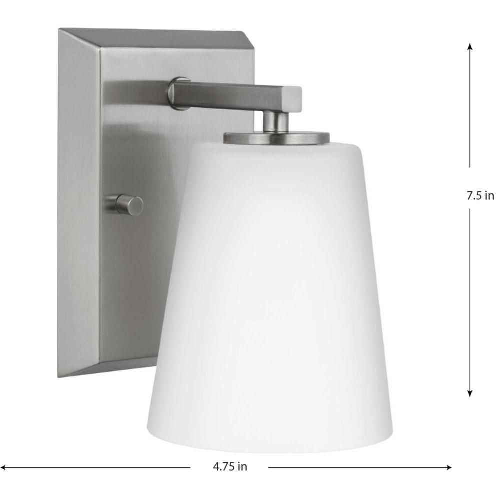 Elegantly extended, the Vertex Collection is composed of angular forms finished in subtle brushed nickel to create a bold design that perfectly complements modern interiors. Glass shades delivers bright illumination to bathrooms and powder rooms in contemporary settings. This versatile fixture can be mounted up or down, increasing its design flexibility. It is cULus damp rated and has a one-year warranty to guarantee your complete satisfaction. Progress Lighting products offer exceptional quality, reliability, and functionality. .