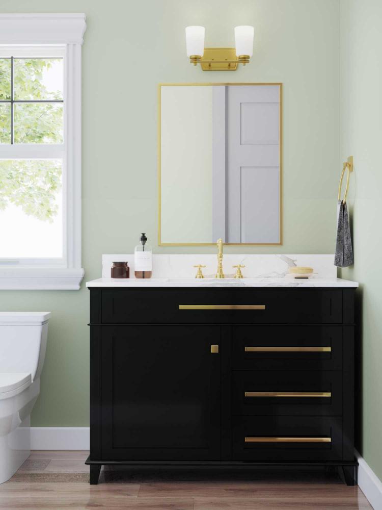 Fundamentally modern but with a traditional twist, the Adley vanity light combines opal glass shades with a curved edge backplate and a simple, straight bar finished in lustrous satin brass. This light is an elegant choice for illuminating new traditional and transitional settings.