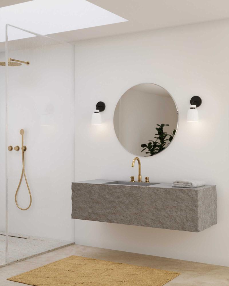The Lexie One-Light Vanity Light is full of spunk with a fresh new style for todays home. A slender minimalist frame finished in Matte Black supports opal glass shades with a distinctive cinched metallic collar.The versatile fixture can be mounted facing up or down, offering the perfect amount of illumination to the room.