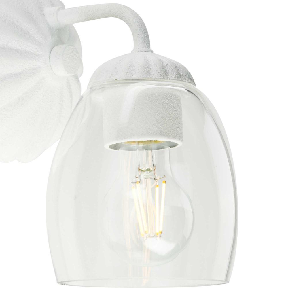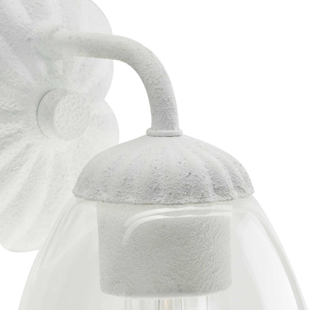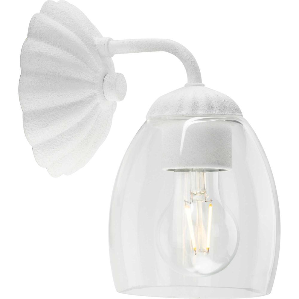 The Quillan One-Light Vanity Light offers a graceful flourish to add distinctive designer touch. Scalloped elements create a richness of detail to complement the clarity of its clear, elliptical glass shade. Each fixture includes both matching and contrasting accent rings. This versatile light can be mounted up or down to provide clear illumination to the room.