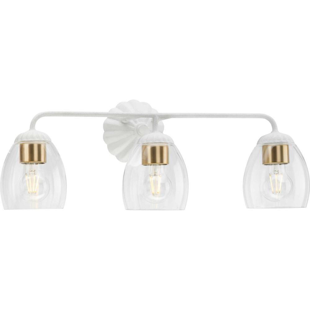 The Quillan Three-Light Vanity Light offers a graceful flourish to add distinctive designer touch. Scalloped elements create a richness of detail to complement the clarity of clear, elliptical glass shades. Each fixture includes both matching and contrasting accent rings. This versatile light can be mounted up or down to provide clear illumination to the room.